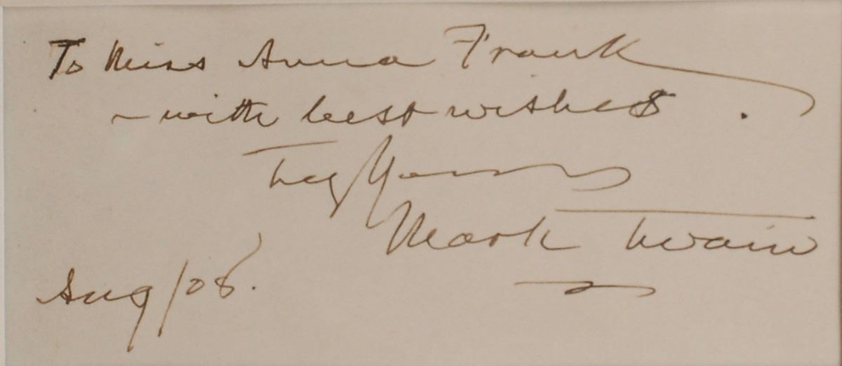 Ink signature and inscription, “To Miss Anna Frank—with best wishes. Truly yours, Mark Twain, Aug/08,” on an off-white 4.75 x 2 slip. Cloth-matted and framed with an image of Clemens to an overall size of 8.25 x 10.25. In fine condition. Accompanied by an unsigned glossy photo of Clemens.