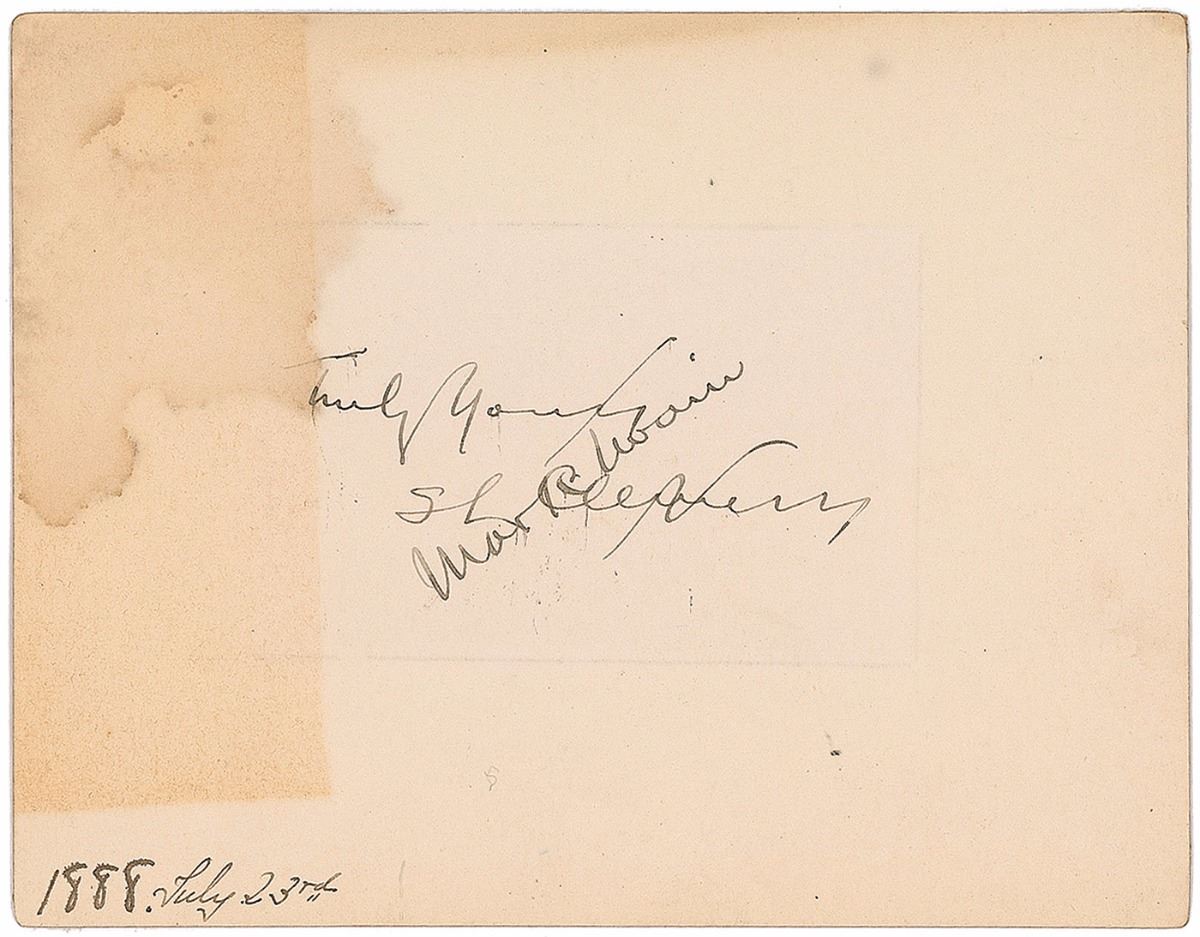 Unusual ink signature, “Truly yours, S. L. Clemens,” with the author signing over the first signature with his pen name, “Mark Twain,” on an off-white 4.5 x 3.5 card. Collector’s ink notation in the lower left corner dates the signature to July 23, 1888. Dampstaining to upper left and an irregular block of toning to left side (touching the first letter of the inscription), otherwise fine condition.