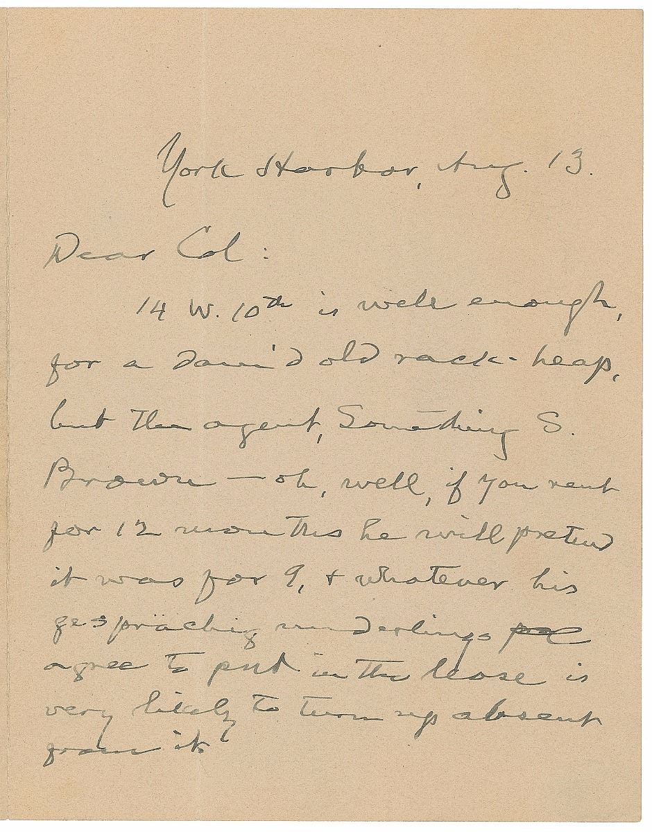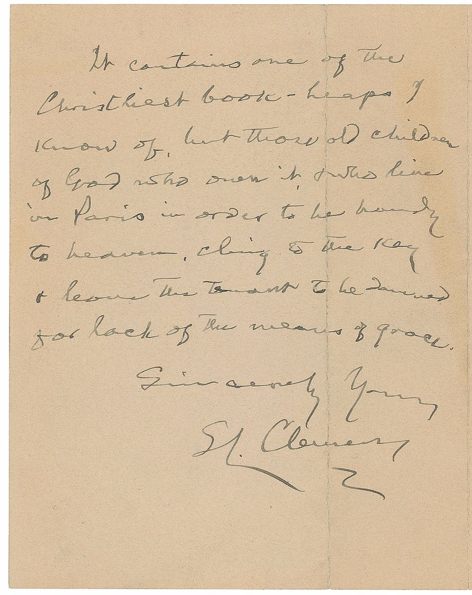 ALS signed “S. L. Clemens,” two pages, 4.5 x 5.75, August 13, 1902. Letter to Colonel Charles Fairchild, in full: “14 W. 10th is well enough, for a damn’d old rack heap, but the agent, something S. Brown—oh, well, if you rent for 12 months he will pretend it was for 9, & whatever his gesprachig underlings agree to put in the lease is very likely to turn up absent grant it. It contains one of the Christliest book-heaps I know of, but those old children of God who own it, & who live in Paris in order to be handy to heaven, cling to the key & leave the tenant to be damned for lack of the means of grace.” In fine condition, with a vertical crease passing through the signature.