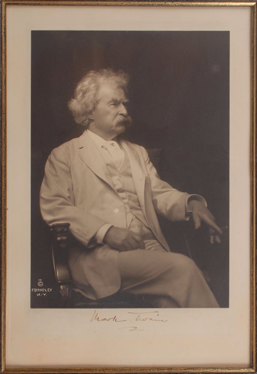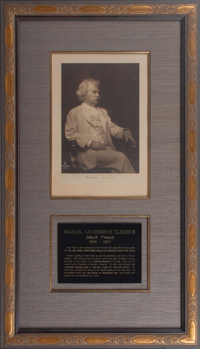 Crystal-clear matte-finish 6.5 x 9 photo of Clemens wearing one of his classic white suits in a seated three-quarter-length pose, affixed to an 8 x 11.75 mount, signed on the mount in fountain pen, “Mark Twain.” Archivally cloth-matted and framed with a descriptive plaque to an overall size of 16.75 x 29. In fine condition. Samuel Clemens was known for his all-white suits, which he claimed made him ‘the only cleanly-clothed human being in all Christendom north of the Tropics.’ This image came from a series of photographs taken in 1907, which he then autographed and sold to raise funds for those affected by the 1906 earthquake in San Francisco. Clemens himself regarded these as the best portraits ever taken of him and they remain among the most iconic images of the author today.