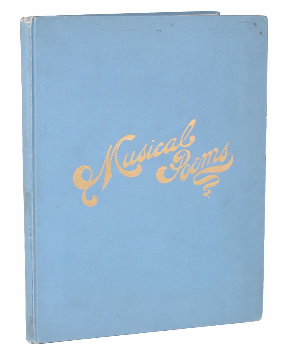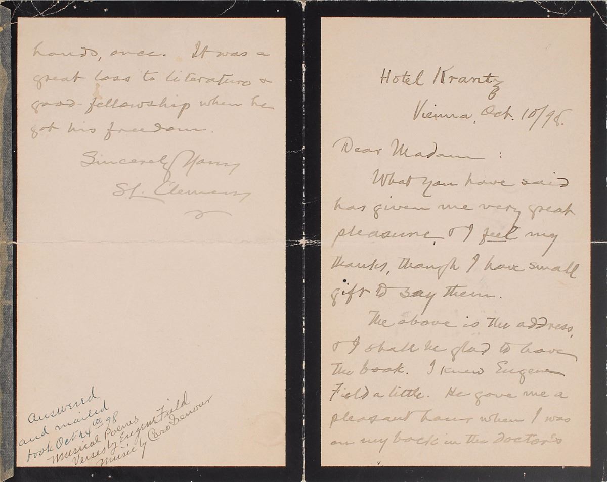 ALS signed “S. L. Clemens,” two pages on two adjoining sheets, 4.5 x 7, October 10, 1898. Letter to composer Caro Smith Senour, affixed to a free end page inside the book Musical Poems. In full: “What you have said has given me very great pleasure & I feel my thanks, though I have small gift to say them. The above is the address, & I shall be glad to have the book. I knew Eugene Field a little. He gave me a pleasant hour when I was on my back in the doctor’s hands, once. It was a great loss to literature & good-fellowship when he got his freedom.” The book features poems by Field set to music by Senour: Musical Poems. First edition. Chicago: The Faunt LeRoy Music Co., 1896. Hardcover, 10.25 x 13, 60 pages. Also later signed and inscribed on the first free end page by Caro Smith Senour, with an additional ALS by her affixed beneath the Clemens letter, in part: “The enclosed letter was sent to me by S. L. Clemens, ‘Mark Twain,’ while he was in Vienna, Austria, and the book he refers to is my original ‘Musical Poems,’ containing some of Eugene Field’s poems which I set to music.” Autographic condition: very good to fine condition. Book condition: VG-/None.
