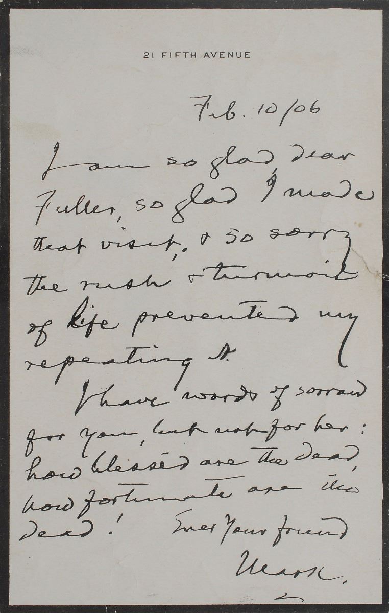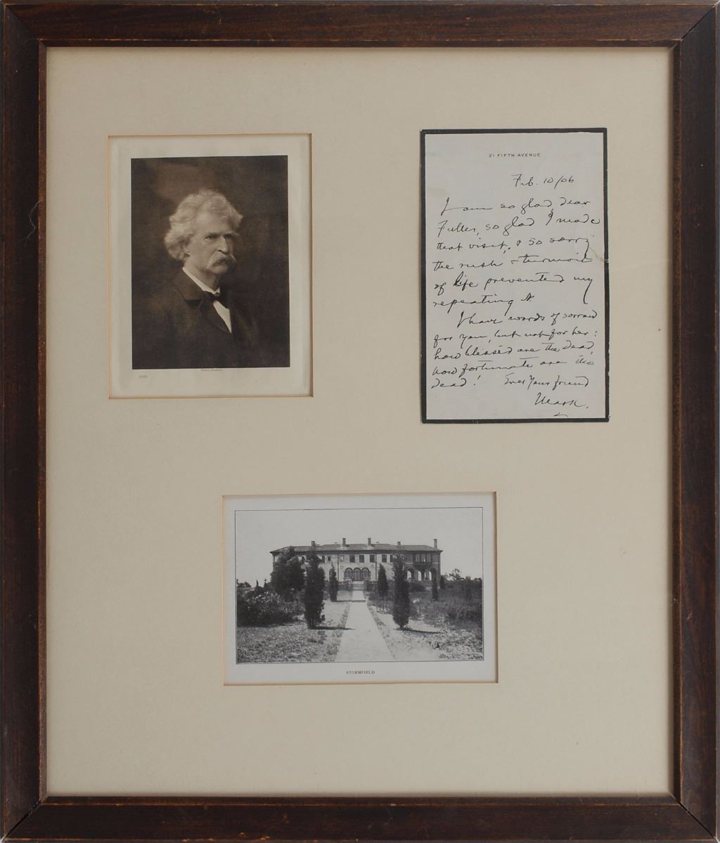 ALS signed “Mark,” one page, 4 x 6.25, 21 Fifth Avenue personal letterhead, February 10, 1906. Letter of condolence to Mr. Frank Fuller on the loss of his wife, Mary, in full: “I am so glad, dear Fuller, so glad I made that visit, & so sorry the rush & turmoil of life prevented my repeating it. I have words of sorrow for you, but not for her: how blessed are the dead, how fortunate are the dead!” Mounted and framed with a portrait of Clemens and an image of his last home, Stormfield, to an overall size of 15.25 x 17.75. In fine condition, with a small tear to right edge.