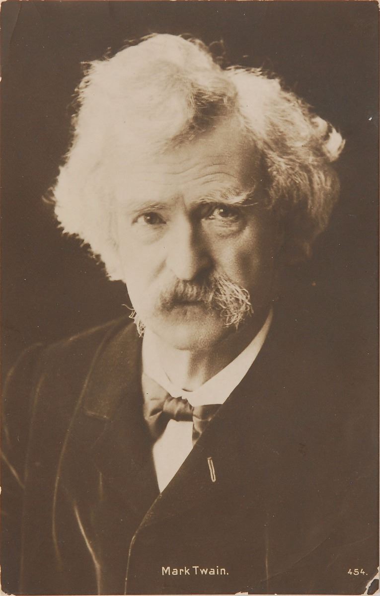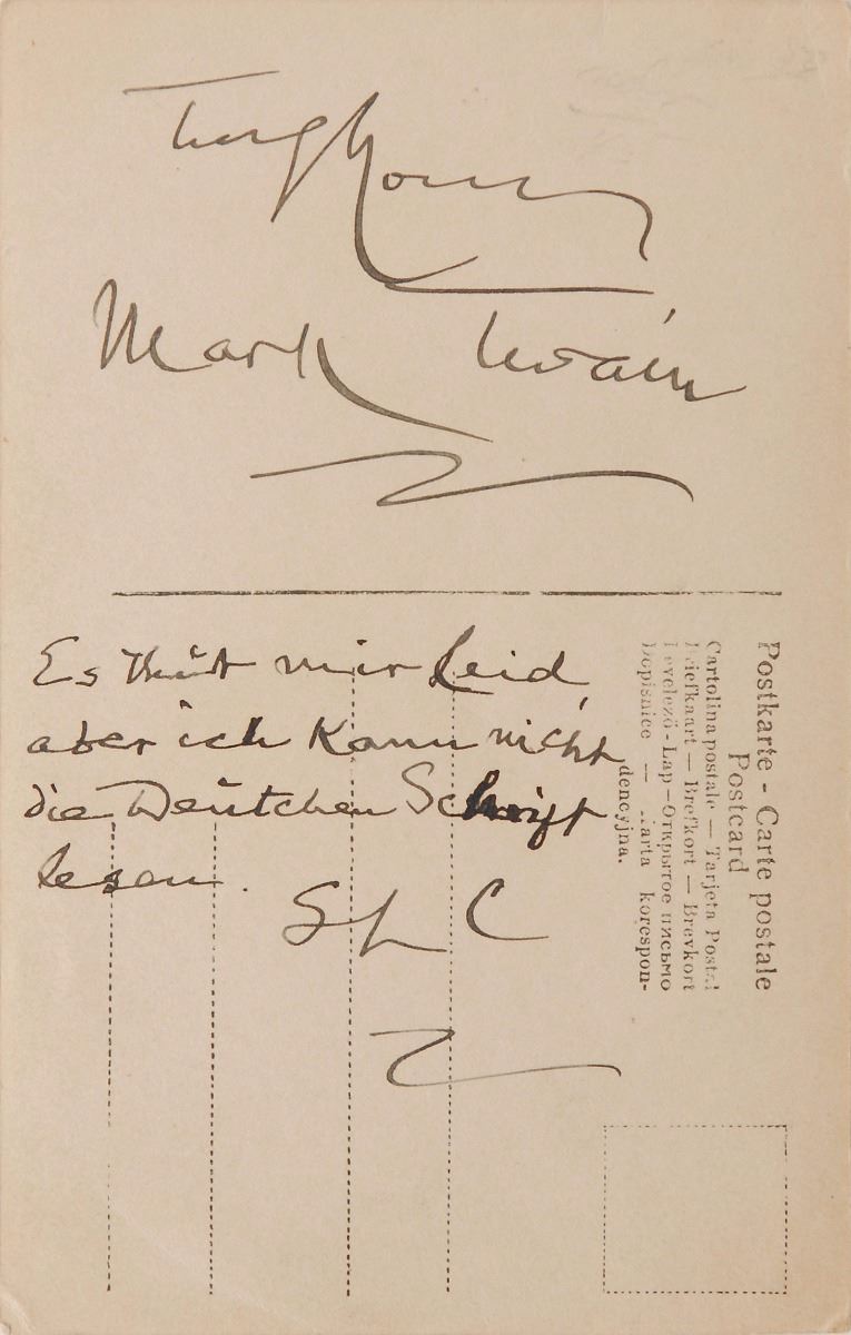 Handsome 3.5 x 5.5 postcard photo of Clemens, signed on the reverse in black ink, “Truly yours, Mark Twain,” with an ANS below in German (translated), “I am sorry but I cannot read the German handwriting. SLC.” In fine condition.