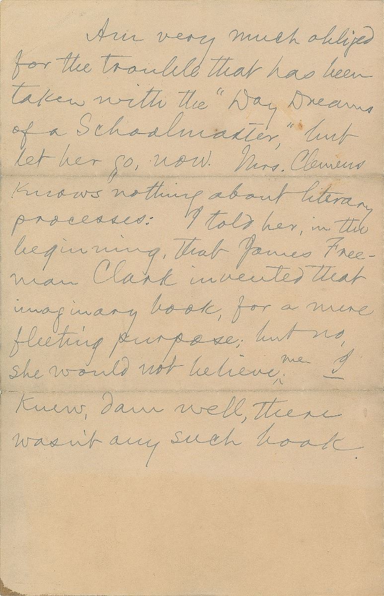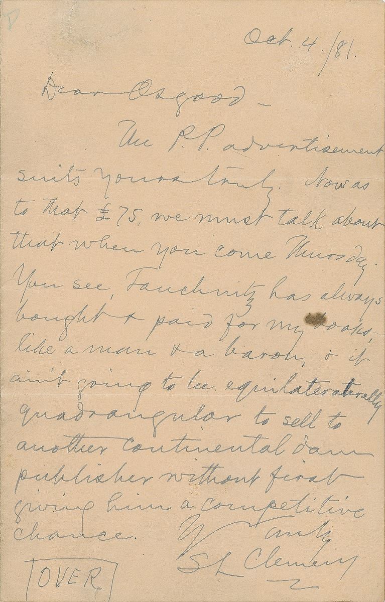 Exceptional ALS signed “S. L. Clemens,” two pages on two adjoining sheets, 5.25 x 8.25, October 4, 1881. Letter to James R. Osgood, in full: “The P. P. advertisement suits yours truly. Now as to that £75, we must talk about that when you come Thursday. You see, Fauchnitz has always bought & paid for my books, like a man & a baron, & it ain’t going to be equilaterally quadrangular to sell to another continental dam publisher without first giving him a competitive chance.” Clemens continues the letter on the reverse of the second integral page, “Am very much obliged for the trouble that has been taken with the ‘Day Dreams of a Schoolmaster,’ but let her go, now. Mrs. Clemens knows nothing about literary processes: I told her, in the beginning, that James Freeman Clark invented that imaginary book, for a mere fleeting purpose; but no, she would not believe me. I knew, dam well, there wasn’t any such book.” In very good to fine condition, with old tape reinforcements to the fold ends and hinge, and an expertly repaired area of paper loss near the top edge of the first page. James R. Osgood was an American publisher whose firm would become Houghton Mifflin. The mention of a “P. P. advertisement” is likely in reference to Clemens’s celebrated third novel, The Prince and the Pauper, which the Osgood & Company published for American readers in early 1882. Osgood would later join Clemens on a riverboat trip collecting material for the travel book Life on the Mississippi, which he would eventually publish in 1883.
