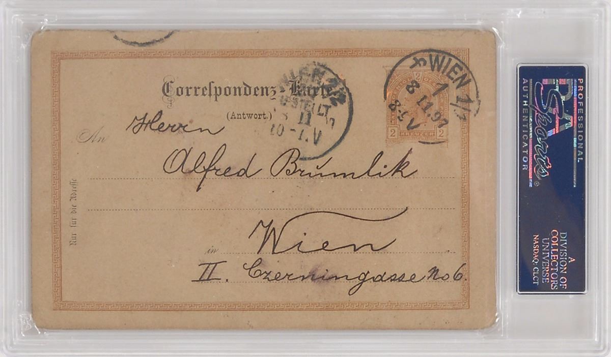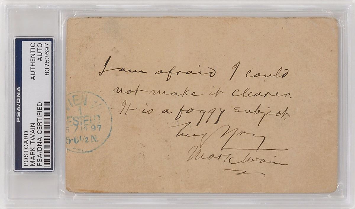 ANS signed “Truly yours, Mark Twain,” on the reverse of an off-white 5.5 x 3.5 German postcard, postmarked November 5, 1897. In full: “I am afraid I could not make it clearer. It is a foggy subject.” Encapsulated in a plastic PSA/DNA authentication holder. In fine condition, with light overall soiling and a postal cancellation near the left edge.