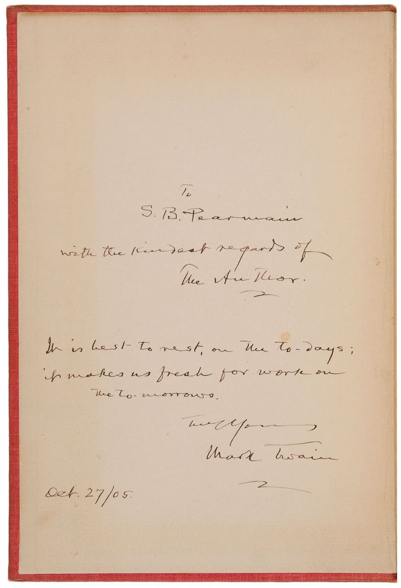 Signed book: The Innocents Abroad. Later printing. NY: Harper and Brothers, 1905. Hardcover, 5.5 x 8, 446 pages. Signed and inscribed on the front pastedown, “To S. B. Pearmain, with the kindest regards of The Author. It is best to rest, on the to-days; it makes us fresh for work on the to-morrows. Truly Yours, Mark Twain, Oct. 27/05.” Autographic condition: fine, with mild toning to edges of pastedown. Book condition: VG-/None. Red cloth-covered boards with stamped lettering and decoration; mild wear to edges; spine sunned; mild soiling to exterior; textblock edges darkened; few minor spots on endpapers; front and rear hinges have been very neatly repaired; few small pencil notes and previous seller’s tiny sticker to ffep. In late October, early November of 1905, Clemens spent two weeks in Boston as the guests of Sumner B. Pearmain and his wife Alice, neighbors of Clemens during his stays in Dublin, New Hampshire, in the summers of 1905 and 1906. In an article from the Boston Sunday Post, dated May 20, 1906, Clemens praises Alice for curing a prolonged stomach aliment, adding that ‘She told me that I needed plenty of food, as I had been starving an excellent digestive apparatus, and there is not a doctor that lives today who can tell me that she was not right in her cure.’”