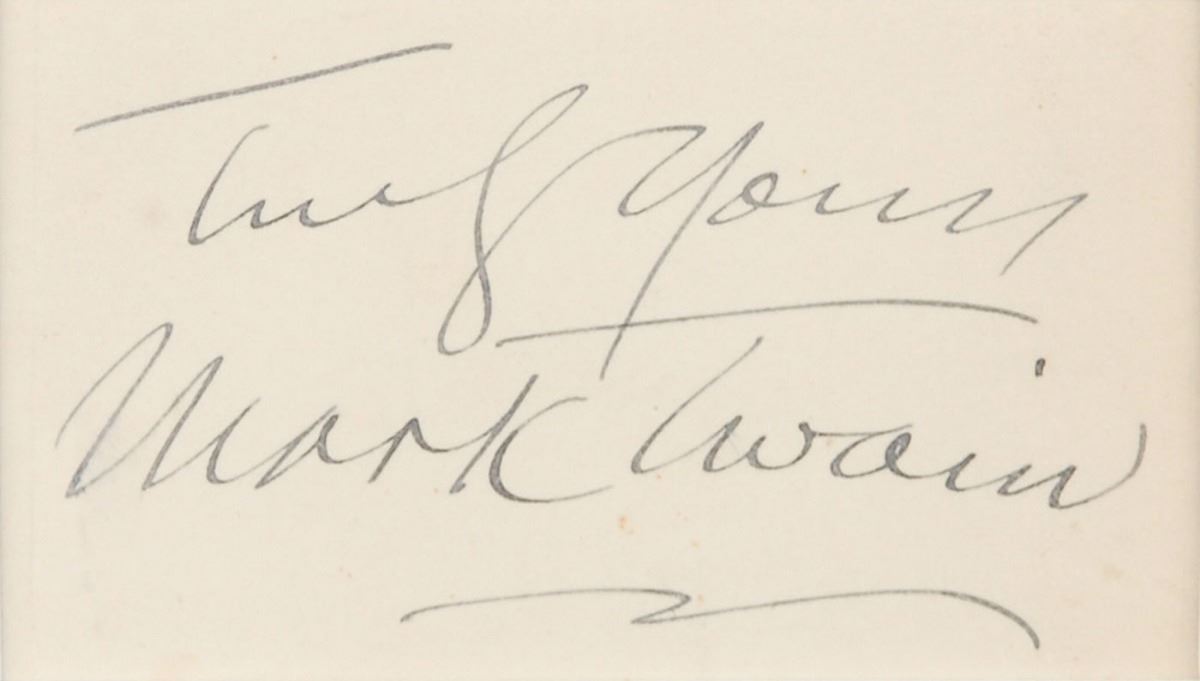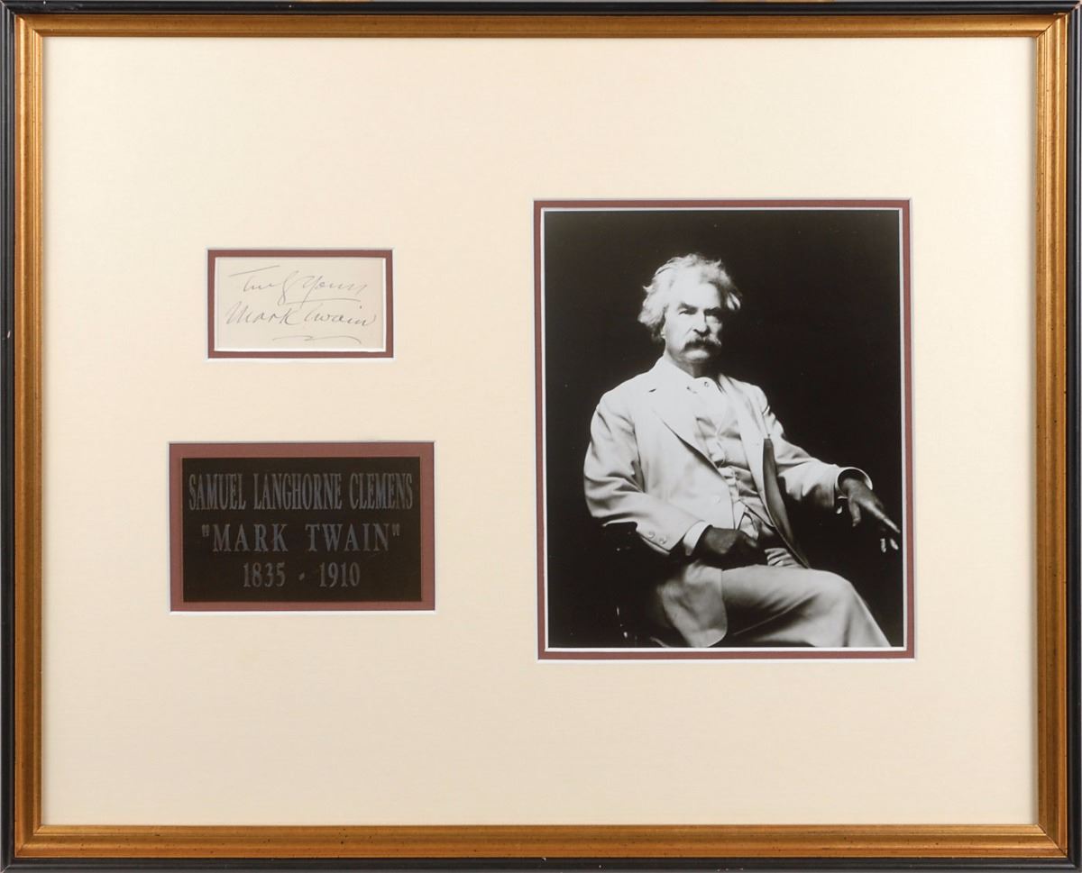 Appealing ink signature, “Truly yours, Mark Twain,” on an off-white 3.5 x 2 card. Attractively double-matted and framed with a plaque and photo to an overall size of 22 x 18. In fine condition.