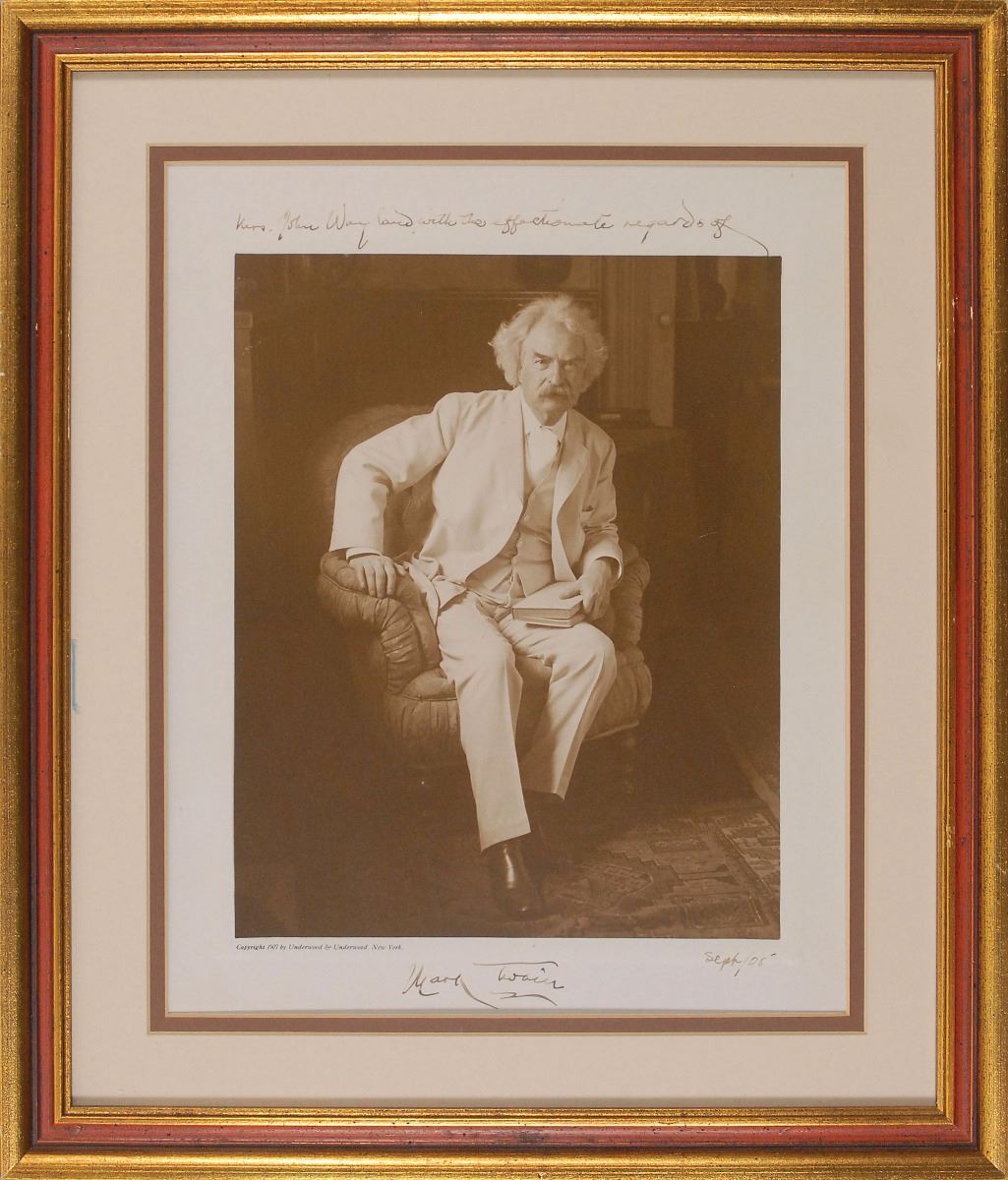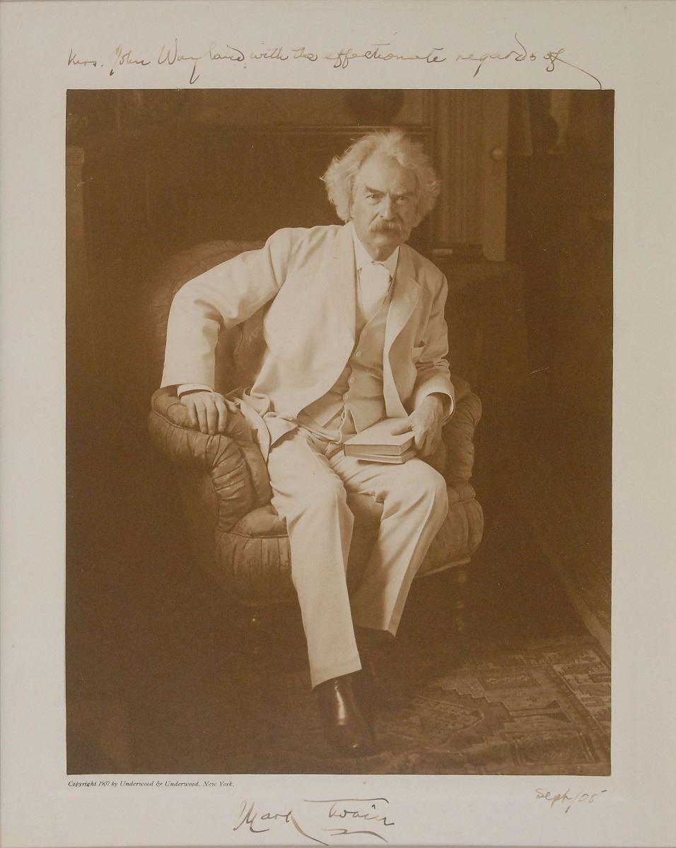 Superlative matte-finish 10 x 12.5 Underwood and Underwood portrait of Clemens clad in his trademark white suit, a book on his lap, signed and inscribed in the wide white borders in black ink, “Mrs. John Wayland, with the affectionate regards of Mark Twain. Sept/08.” The copyright notice printed in the lower left reads, “Copyright 1907 by Underwood & Underwood, New York.” Gorgeously double-matted and framed to an overall size of 14.75 x 17. In fine condition. An exceptional oversized portrait boasting a bold signature and exceptionally clean, bright image.