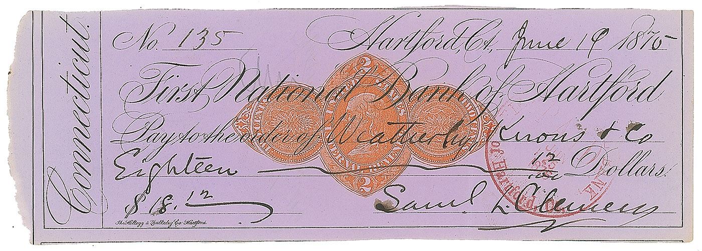 First National Bank of Hartford check, 8 x 2.75, filled out and signed by Clemens, “Saml. L. Clemens,” payable to Weatherby, Knous & Co. for $18.12, June 19, 1875. In fine condition. The first major publication to loosely portray Clemens’s upbringing on the Mississippi River, The Adventures of Tom Sawyer was first published in 1876, only a year after this check was signed.