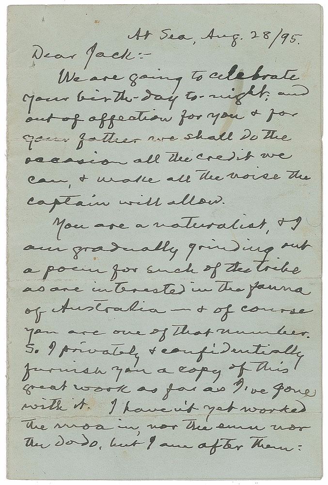 ALS signed “Mark Twain,” three pages on two adjoining sheets, 4 x 6, August 28, 1895. Letter to "Jack," written "At Sea." In part: "We are going to celebrate your birth-day to-night; and out of affection for you & for your father we shall do the occasion all the credit we can, & make all the noise the captain will allow. You are a naturalist, & I am gradually grinding out a poem for such of the tribe as are interested in the fauna of Australia—& of course you are one of that number. So I privately & confidentially furnish you a copy of this great work as far as I've gone with it. I haven't yet worked the moa in, nor the emu nor the dodo, but I am after them." Clemens fills the rest of the letter with a five-stanza "Invocation," which concludes: "Come, Kangaroo, the good & true, / Foreshortened as to legs, / And body tapered like a churn, / And sack marsupial, i' fegs! / And tell us why you linger here, / Thou relic of a vanished time, / When all your friends as fossils sleep / Immortalized in lime." In very good to fine condition, with scattered light creasing, and some splitting to one of the several horizontal folds.