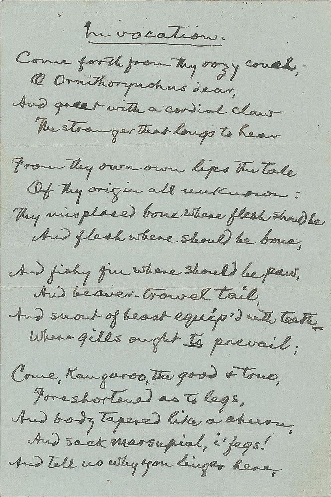 Inspired by the wildlife of Australia, Twain's humorous poem was first printed in The Mercury in Australia on November 2, 1895. Clemens himself printed it in Following the Equator: A Journey Around the World in 1897. The Mercury reported that at a lecture Clemens had stated: 'I have a poem. I have written a poem only once in 30 years. I have now written one of four stanzas...I always have an inspiration to write a poem—once every 30 years...First I thought of Sydney Harbour...Then I thought of the fauna of Australia...I made a list of them and began...I can say now that the most difficult thing in the world to do is to write poetry when you don't know how.'