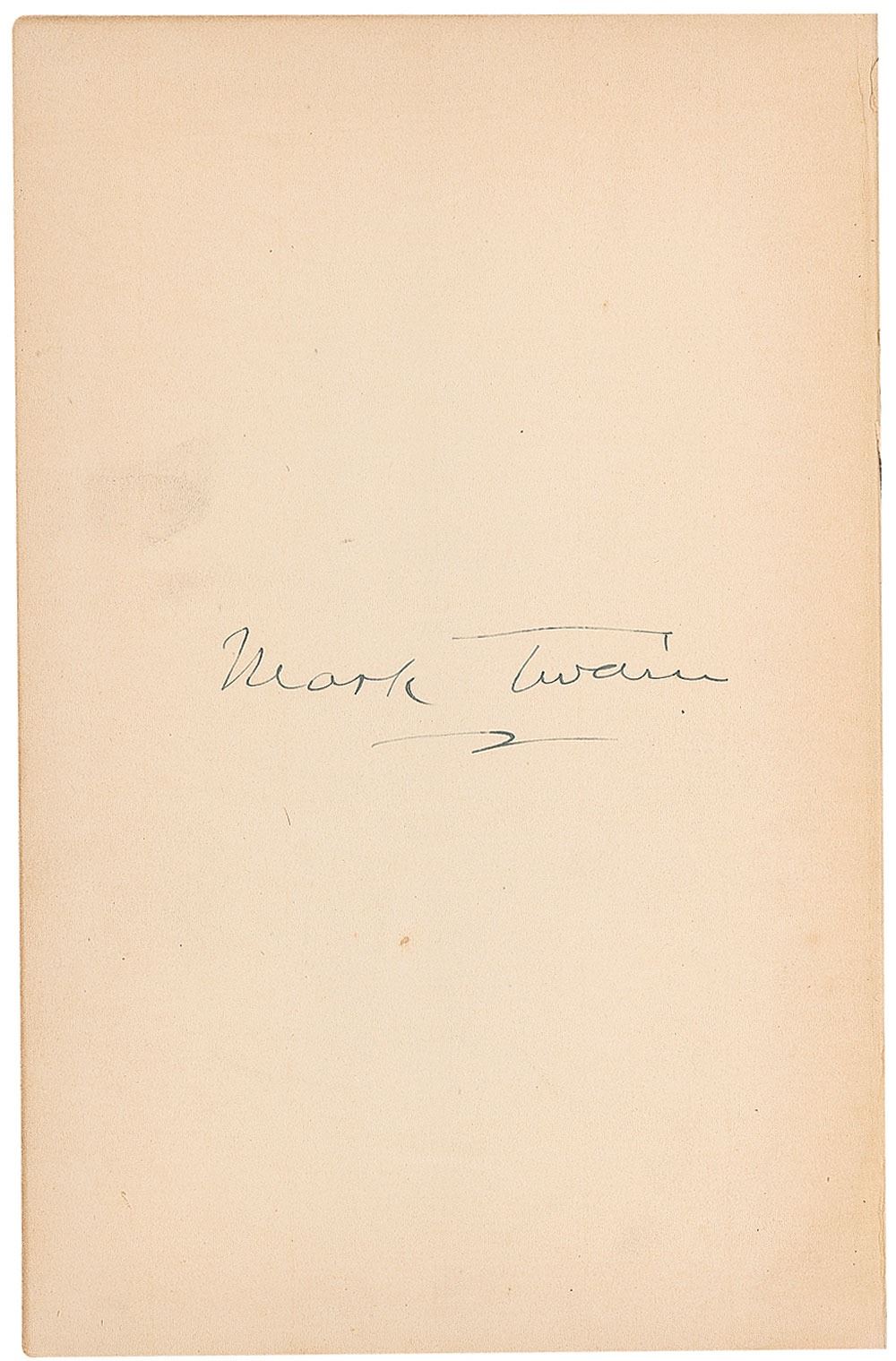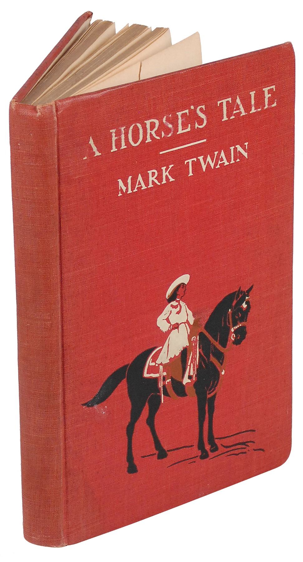 Signed book: A Horse’s Tale. First edition. NY: Harper and Brothers, 1907. Hardcover, 5.5 x 8.25, 153 pages. Signed on the front pastedown in black ink, “Mark Twain.” Autographic condition: fine. Book condition: G+/None. Red cloth-covered boards; mild wear to edges, with small tears in cloth at corners; spine sunned (title ink has disappeared); approximately 1.5? light waterstain to front at spinetail, affecting exterior only; light rubbing to front, with portion of title gone; light soiling, front hinge cracked; approximately 1? tear to upper edge of title-page. Clemens wrote this story as a protest against bull fighting at the request of Minnie Maddern Fiske.