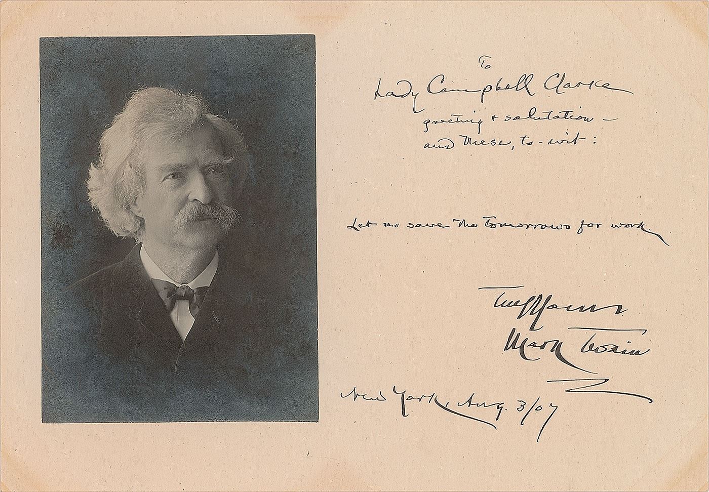 Desirable AQS on an off-white 10.25 x 7 card bearing an affixed portrait of the author. In full: "To Lady Campbell Clarke, greeting & salutation—and these, to-wit: Let us save the tomorrows for work. Truly yours, Mark Twain, New York, Aug. 3/07." In fine condition, with light toning to the edges and corners, and moderate silvering to the image. A highly appealing, boldly signed piece.