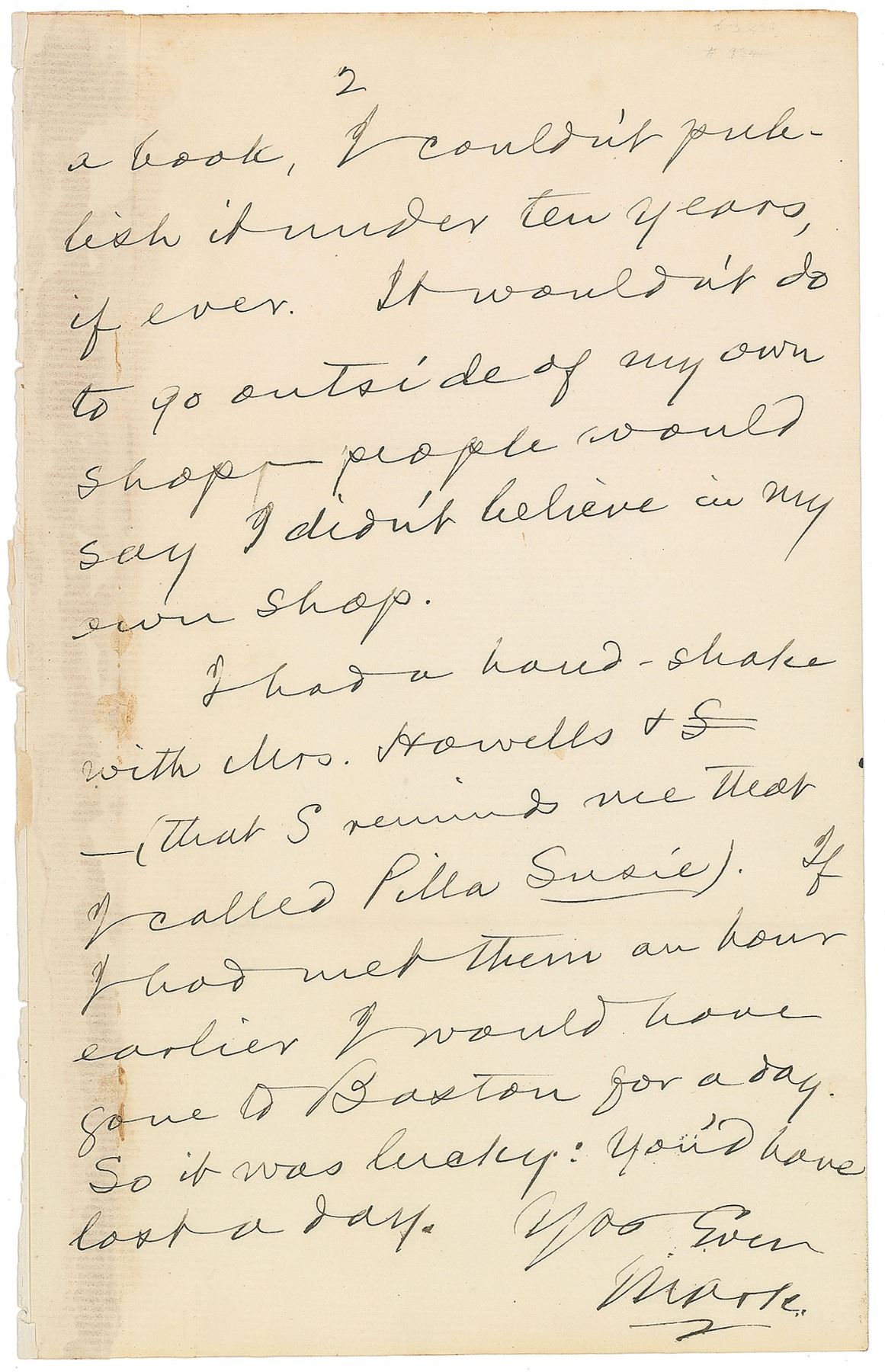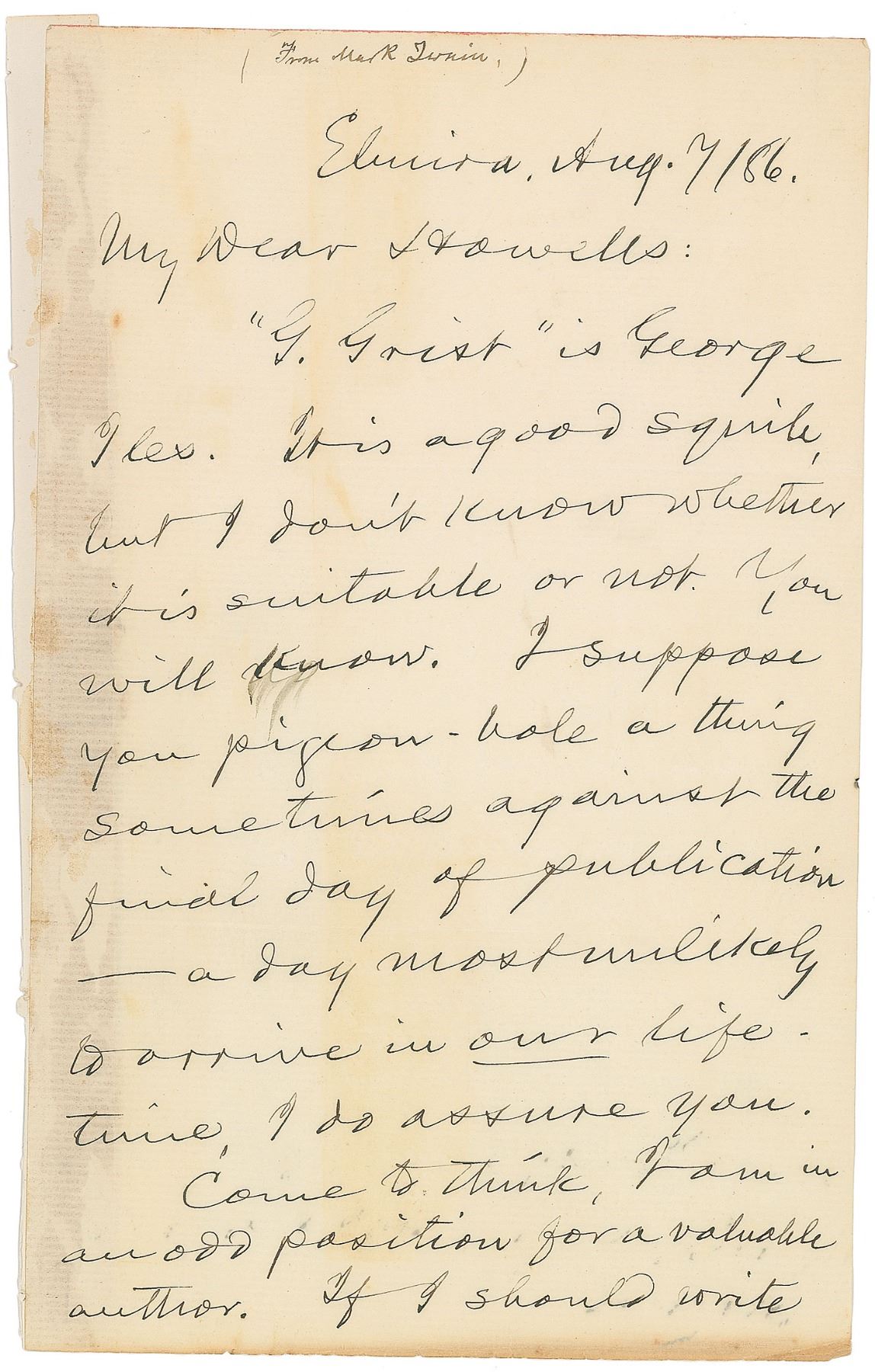 ALS signed “Mark,” two pages, 5.5 x 9, August 7, 1886. Letter to longtime friend and fellow author William Dean Howells, in part: "'G. Grist' is George Iles. It is a good squib, but I don't know whether it is suitable or not. You will know. I suppose you pigeon-hole a thing sometimes against the final day of publication—a day most unlikely to arrive in our life-time, I do assure you. Come to think, I am in an odd position for a valuable author. If I should write a book, I couldn't publish it under ten years, if ever. It wouldn't do to go outside of my own shop-people would say I didn't believe in my own shop. I had a hand-shake with Mrs. Howells…If I had met them an hour earlier I would have gone to Boston for a day. So it was lucky: you'd have lost a day." In very good to fine condition, with light staining from, and show-through from, old mounting remnant strips. Accompanied by a custom-made presentation folder and slipcase, as well as a halftone photo of the authors together. This letter seems to refer to the publication of the book Mark Twain's Library of Humor, an anthology of humorous stories by a wide selection of American authors. Although the project had begun in 1880, the book was not published until 1888. In reality, Clemens did very little work besides lending his name to the title, and Howells served as the anonymous editor.