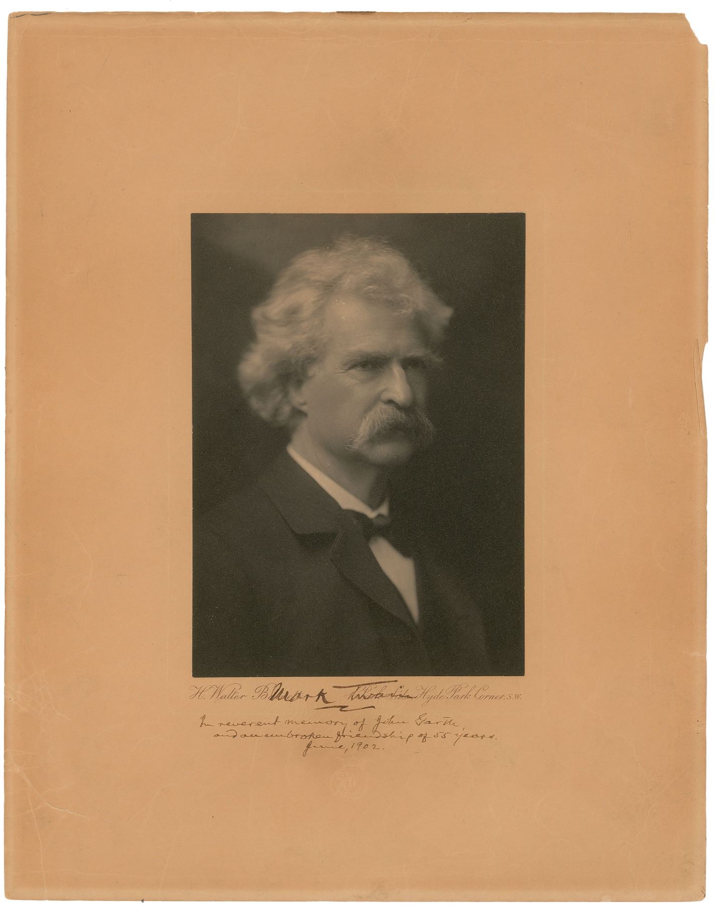 Exceptional matte-finish 4.5 x 6.25 H. Walter Barnett portrait of Twain, affixed to its original 9.5 x 12 photographer's mount, signed and inscribed in fountain pen below the image, "Mark Twain, In reverent memory of John Garth, and an unbroken friendship of 55 years. June, 1902." In very good to fine condition, with scattered light creasing, and small tears and chips to the edges of the mount.