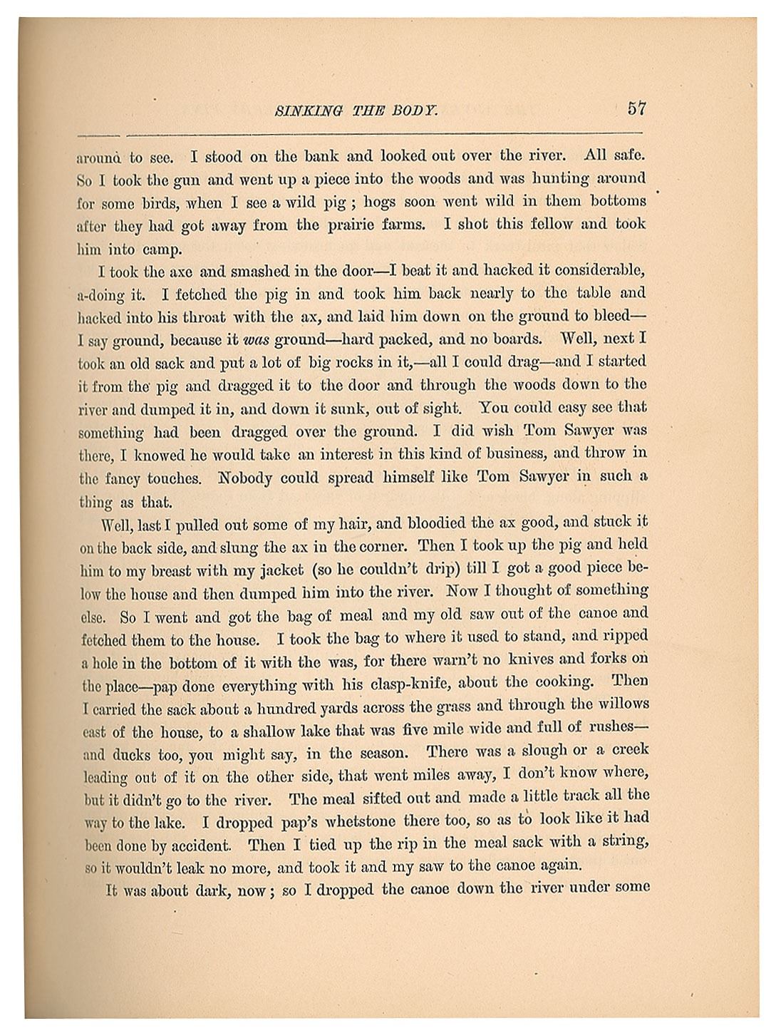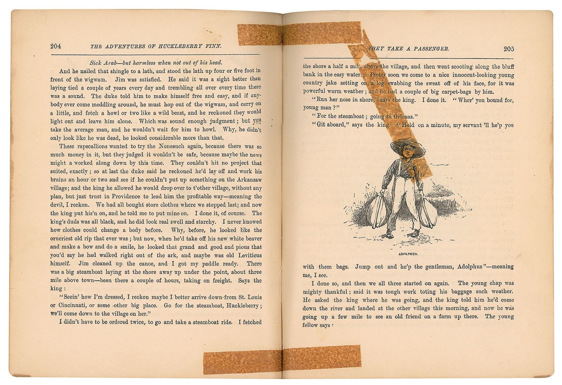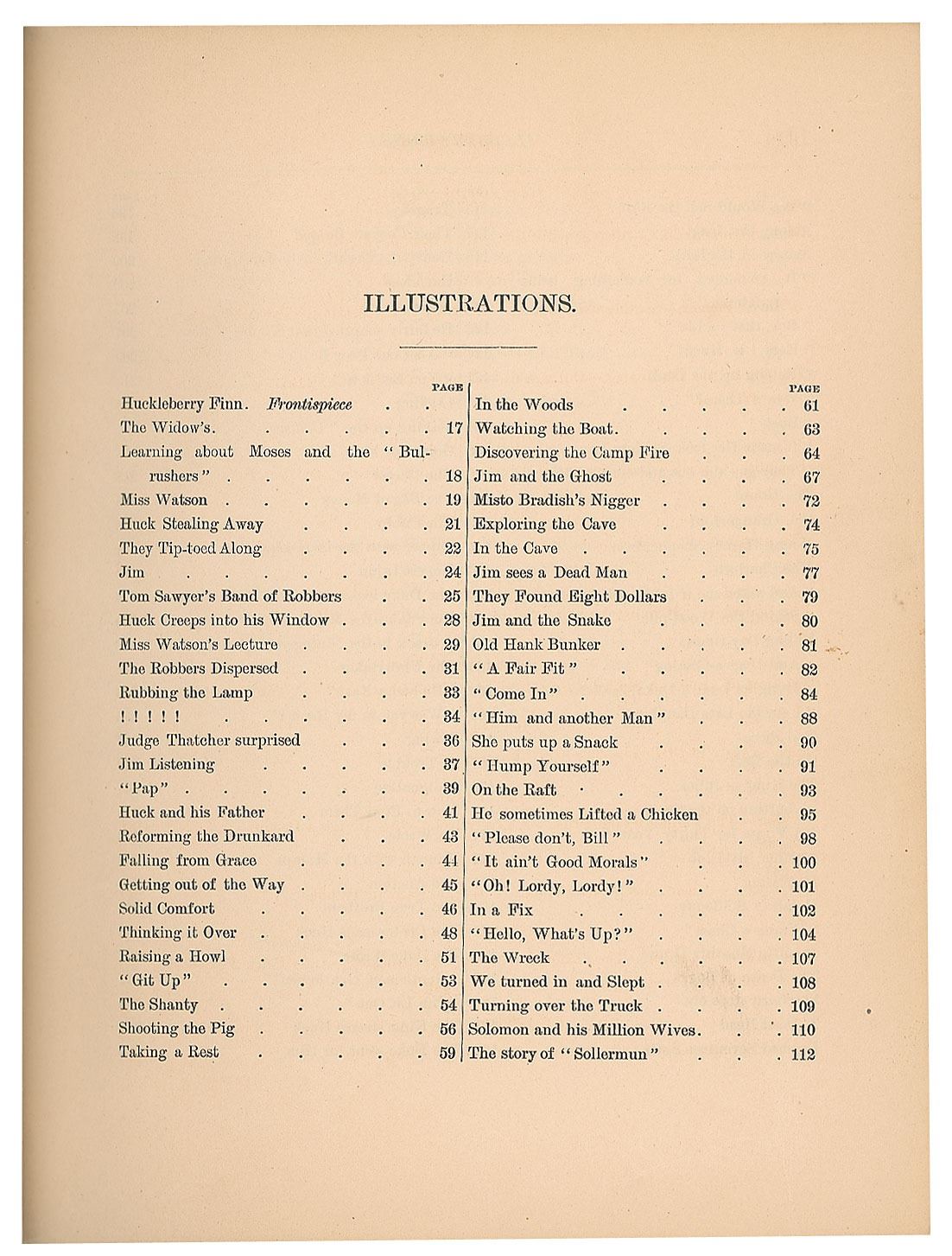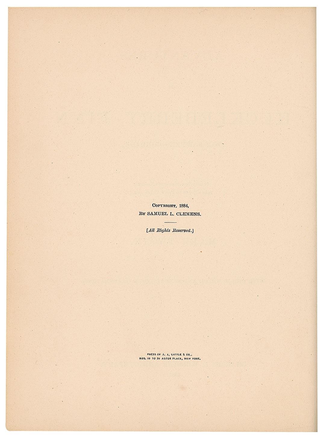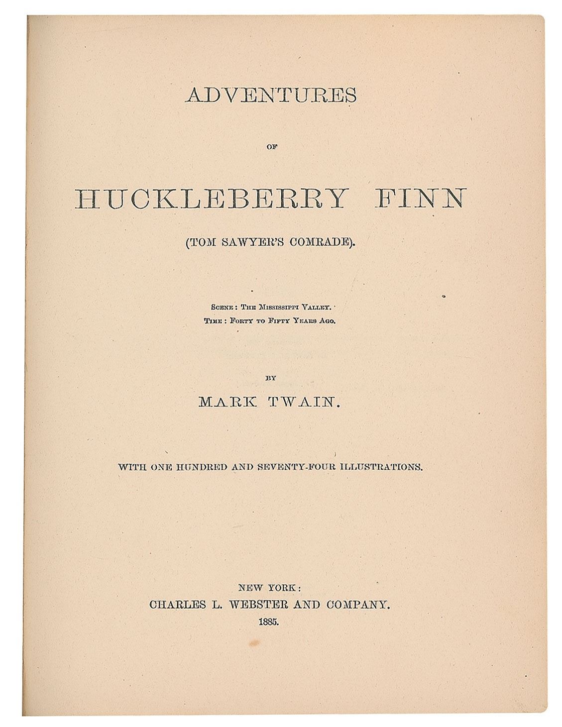 Unsigned first edition book: Adventures of Huckleberry Finn. First American edition, first printing (containing the traditional points of issue including the erroneous page reference "88" on page 13; the misprint "with the was" on page 57; and the misprint "Decided" on page 9). NY: Charles L. Webster and Company, 1885. Hardcover, 7 x 8.75, 366 pages. Book condition: VG-/None, with cracked and repaired hinges, rubbing to spine, edgewear, and tape stains to a few pages. Adventures of Huckleberry Finn was controversial upon its release and banned from several public libraries over objections to its perceived crudeness; nevertheless it has always been incredibly popular. Often cited as 'The Great American Novel,' this first edition of Huckleberry Finn is deserving of a place in any literary collection.