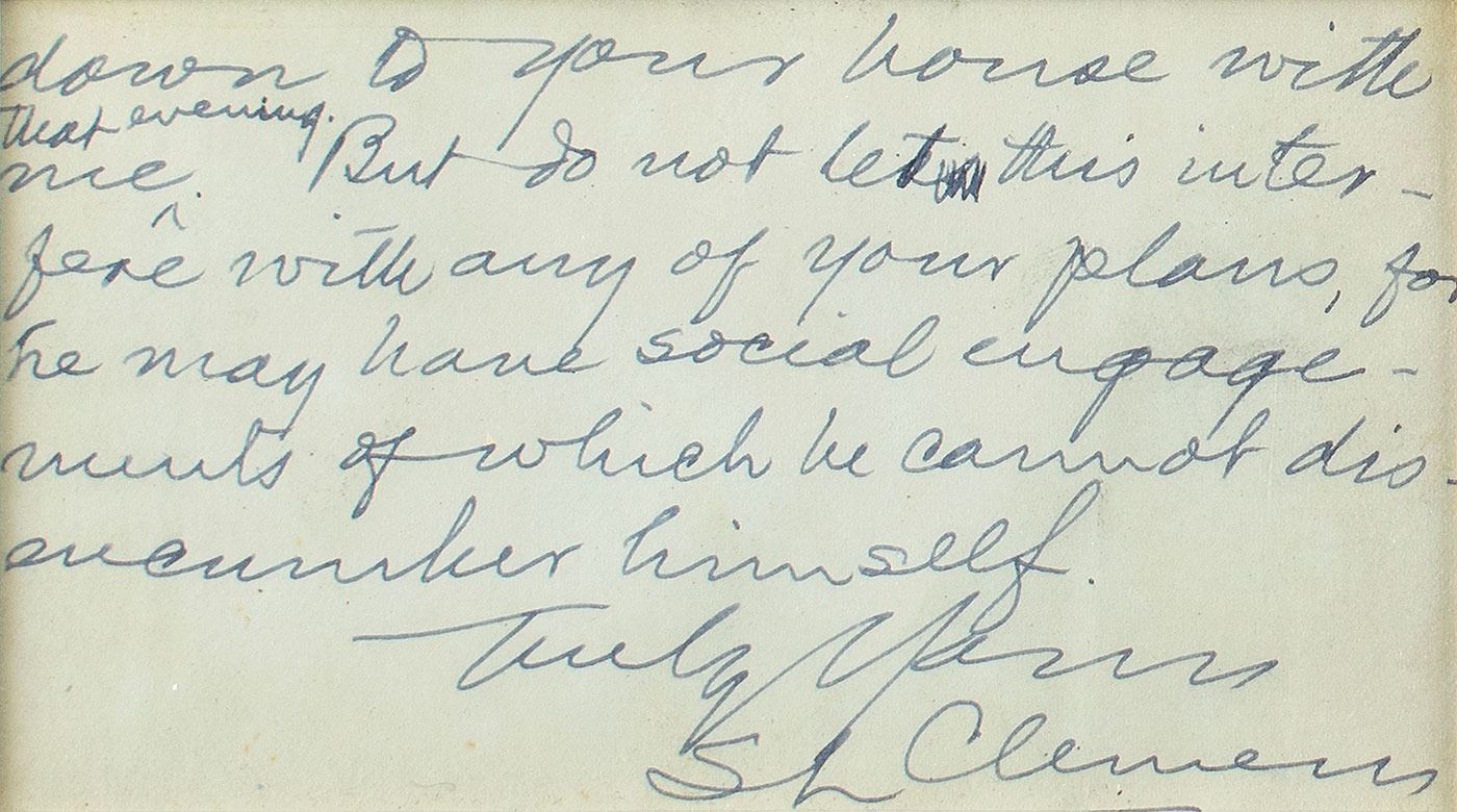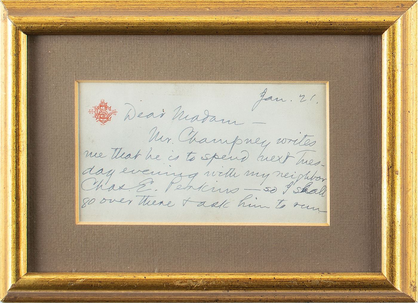 ALS signed “S. L. Clemens,” one page both sides, 5 x 3, personal monogram letterhead, January 21. Letter to a lady, in full: "Mr. Champney writes me that he is to spend next Tuesday evening with my neighbor Chas. E. Perksin—so I shall go over there & ask him to sundown to your house with me that evening. But do not let this interfere with any of your plans, for he may have social engagements of which he cannot disencumber himself." Matted and framed with class on both sides to an overall size of 8.75 x 6.25. In fine condition.