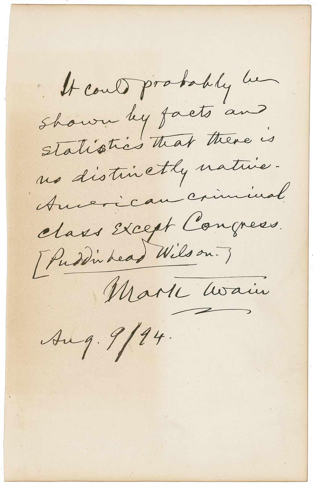 AQS, signed “Mark Twain,” on an off-white 4.75 x 7.5 album page. Clemens pens a quote from Pudd’nhead Wilson: “It could probably be shown by facts and statistics that there is no distinctly native American criminal class except Congress. [Puddinhead Wilson]. Mark Twain, Aug 9/94.” A light block of toning to left side over a portions of quote and signature, and light toning along other edges, otherwise fine condition.