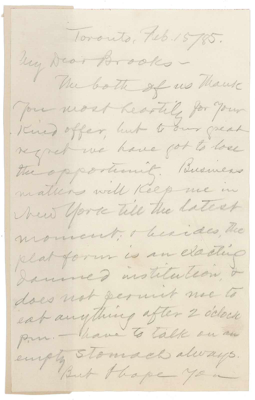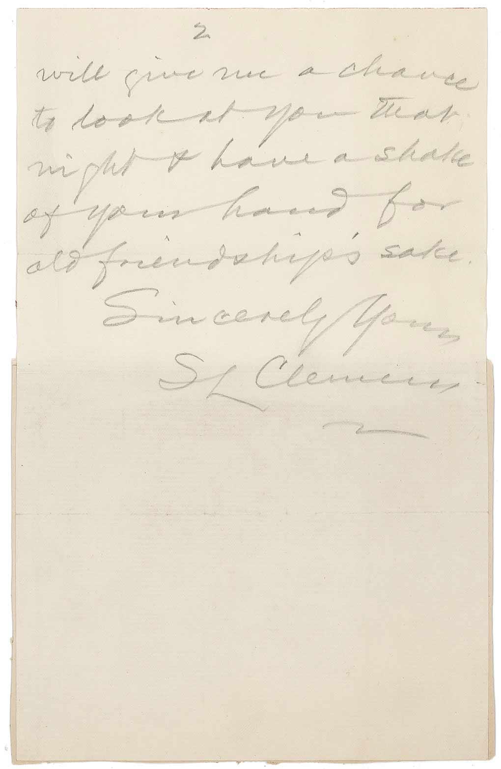 ALS in pencil signed “S. L. Clemens,” two pages, 5.75 x 9, February 15, 1885. Letter to Noah Brooks. In part: “The both of us thank you most heartily for your kind offer, but to our great regret we have got to lose the opportunity. Business matters will keep me in New York till the latest moment, & besides the platform is an exacting damned institution & does not permit me to eat anything after 2 o’clock p.m.—have to talk on an empty stomach always.” In fine condition, with wrinkling and show-through from heavy stock scrapbook remnants affixed to reverse of both pages, only lightly affecting appearance.