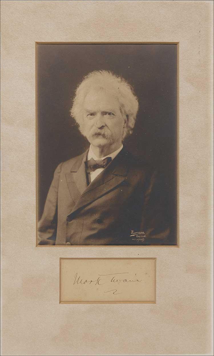 Ink signature, “Mark Twain,” on an off-white card. Matted with a vintage unsigned Marceau portrait of Clemens, to an overall size of 7.5 x 12.5. In very good condition, with uniform toning, a few spots, and a light vertical crease to right side. Pre-certified PSA/DNA and RRAuction COA.
