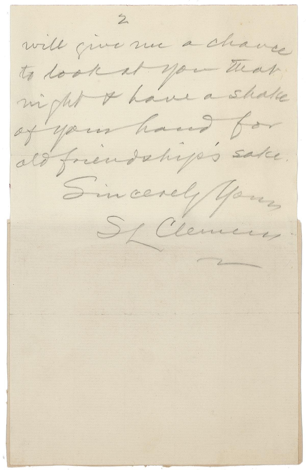 ALS in pencil signed “S. L. Clemens,” two pages, 5.75 x 9, February 15, 1885. Letter to Noah Brooks. In part: “The both of us thank you most heartily for your kind offer, but to our great regret we have got to lose the opportunity. Business matters will keep me in New York till the latest moment, & besides the platform is an exacting damned institution & does not permit me to eat anything after 2 o’clock p.m.—have to talk on an empty stomach always.” In fine condition, with wrinkling and show-through from heavy stock scrapbook remnants affixed to reverse of both pages, only lightly affecting appearance.