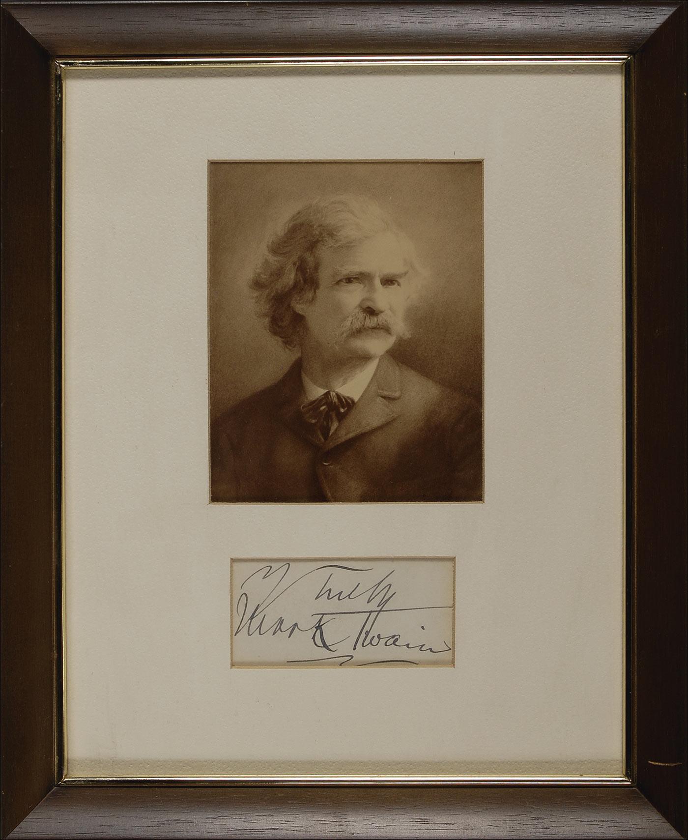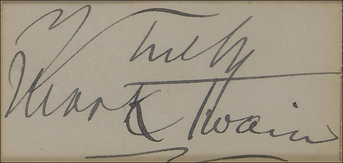 Vintage fountain pen signature, “Y(ours) Truly, Mark Twain,” on an off-white 3 x 1.5 card. Matted and framed with a sepia portrait to an overall size of 9 x 11. In fine condition. Pre-certified PSA/DNA and RRAuction COA.