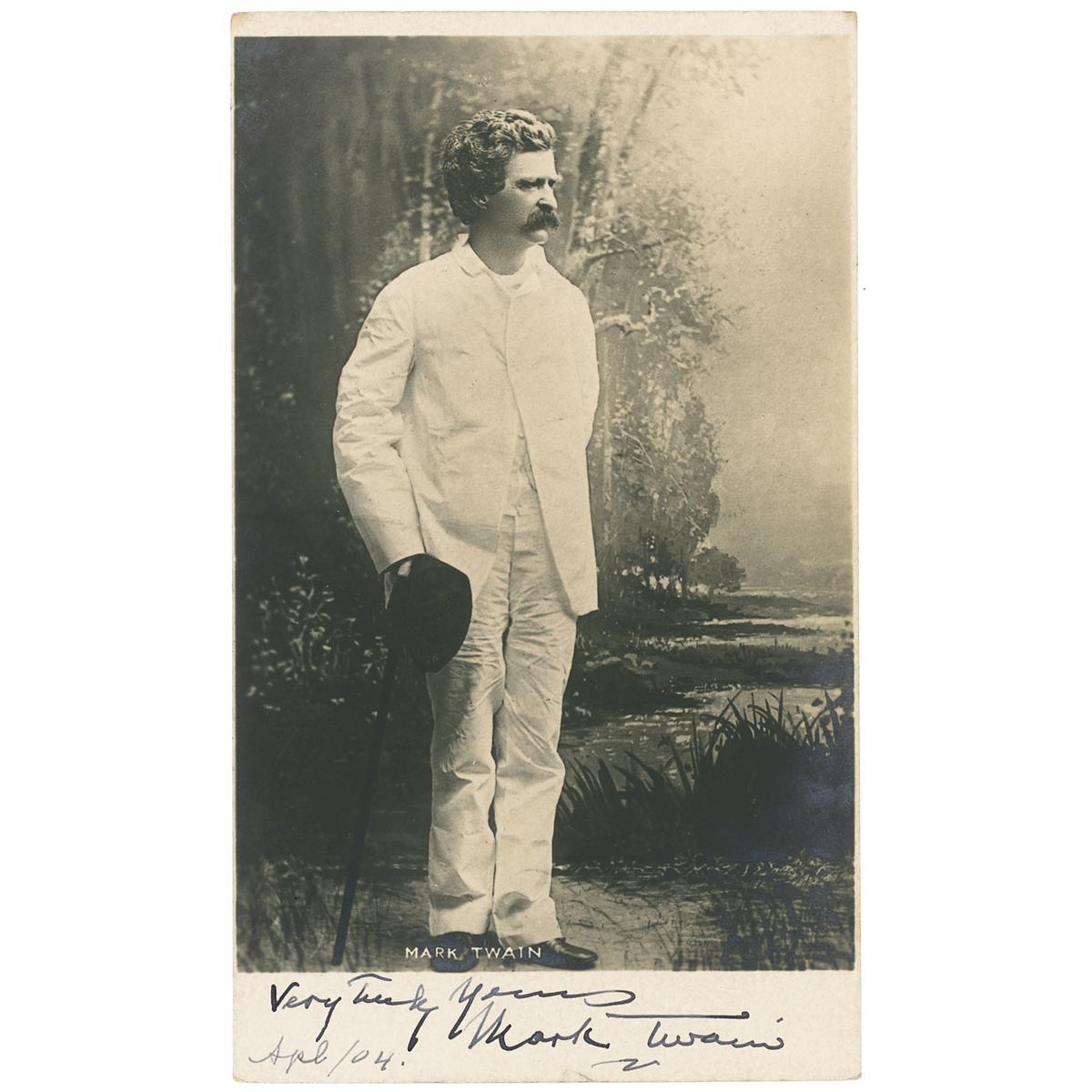 Dignified vintage 3.25 x 5.5 full-length postcard photo of the author dressed in white holding his hat and walking stick, signed in the lower border in black ink, “Very truly yours, Mark Twain, Apl/04.” In fine condition, with lightly trimmed side borders and some scattered light silvering to darker portions of background.