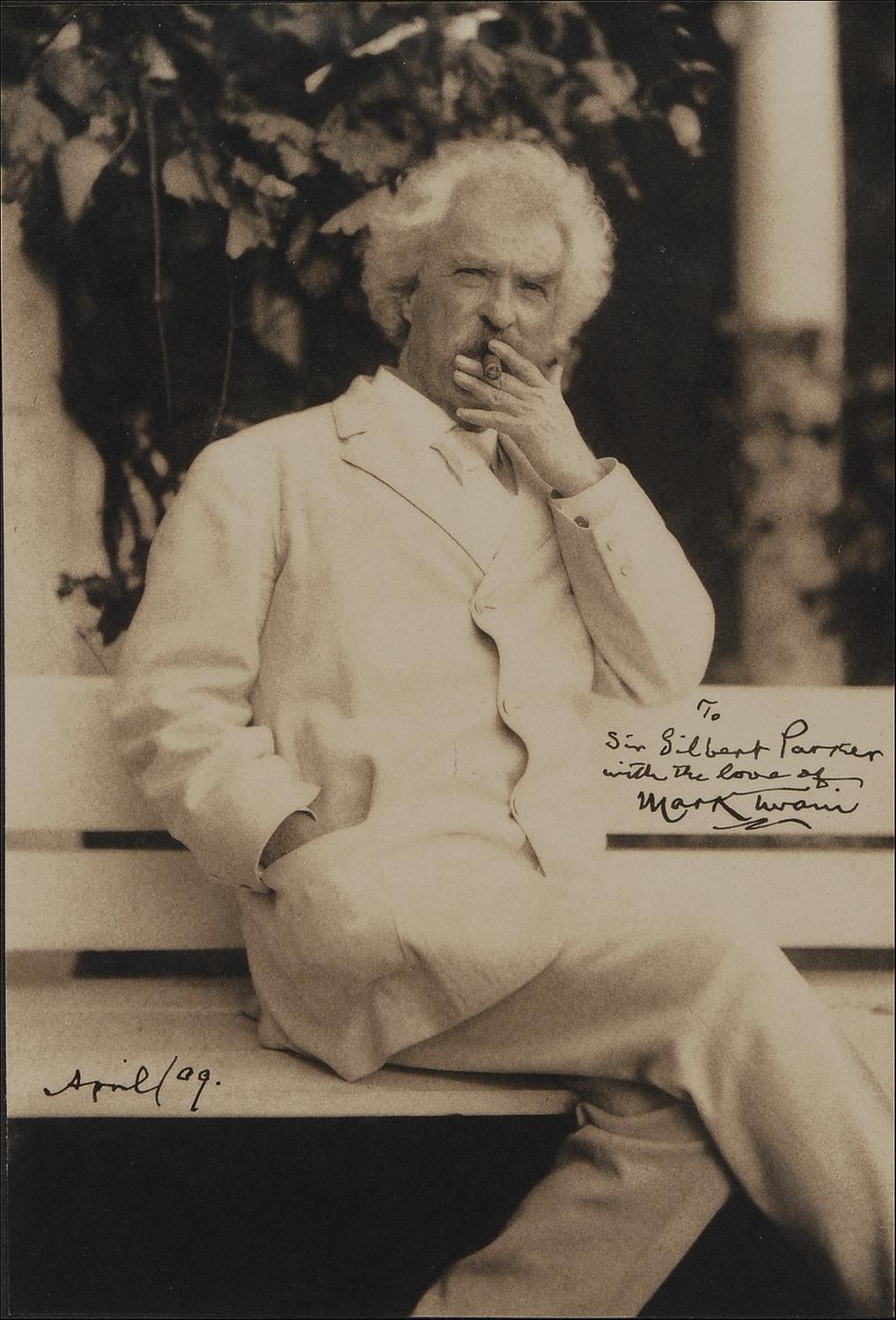 Fantastic vintage platinum or matte-finish 5 x 7 photo of Clemens in his trademark white suit smoking a cigar, signed and inscribed in fountain pen to novelist Gilbert Parker, “To Sir Gilbert Parker, with the love of Mark Twain, April/09.” Photo appears to be affixed to a slightly larger mount, and is triple matted and framed to an overall size of 14 x 15.5. In fine condition.