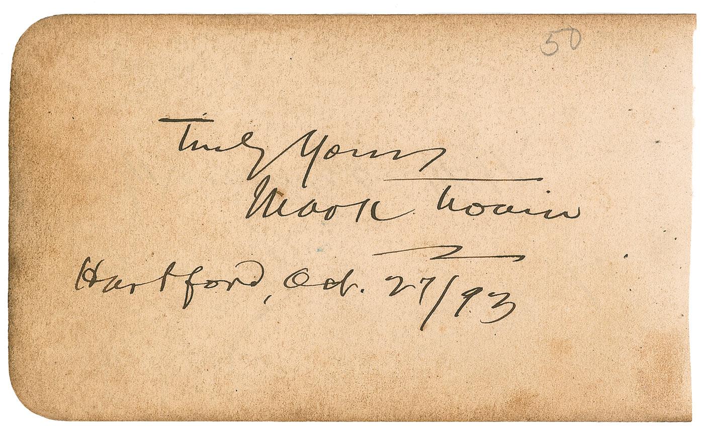 Vintage fountain pen signature, “Truly Yours, Mark Twain, Hartford, Oct. 27/93,” on an off-white 5.75 x 3.5 album page. In very good condition, with heavy toning and soiling.