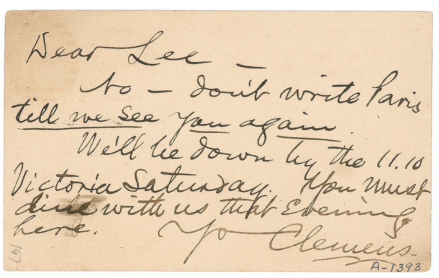 ALS signed “Clemens” on the reverse of a 4.75 x 3 government postcard, no date but postmarked September 26, 1873 in London. Clemens writes to Henry Lee. In full: “No—don’t write Paris till we see you again. We’ll be down by the 11.10 Victoria Sunday. You must dine with us that evening here.” For emphasis, the author has boldly underlined the words, “till we see you again.” Scattered soiling, slight smudging from an erasure, a collector’s filing notation beneath the signature, and show-through from a postal cancellation on the front side, otherwise fine condition. The author had traveled to London in 1873 for a series of profitable lectures—a typical practice whenever Clemens felt he was in need of extra money—and here all but demands that Mr. Lee not proceed with some type of plan already in motion “till we see you again.” In October, Clemens presented six such lectures in London and another in Liverpool. His London appearances were especially successful, where the somewhat reserved and skeptical British audience—unaccustomed to American entertainment—eventually came out in droves with many disappointed people turned away from the overcrowded theater.