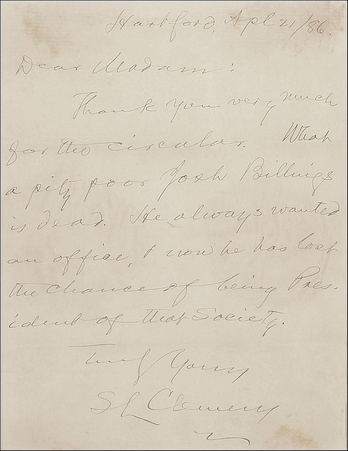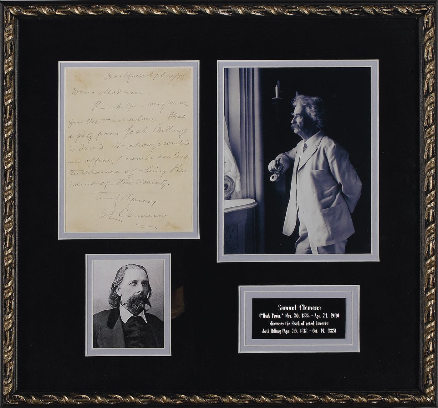 ALS signed “S. L. Clemens,” one page, 5.5 x 7, April 21, 1886. Letter to an unidentified woman. In full: “Thank you very much for the circular. What a pity poor Josh Billings is dead. He always wanted an office, & now he has lost the chance of being President of that Society.” Attractively double suede matted and framed, with a portrait of Clemens, a portrait of Billings, and a descriptive plaque, to an overall size of 18.75 x 17.5. In fine condition, with scattered toning (perhaps from adhesive on reverse), a bit heavier to each corner, none affecting the crisp signature.
