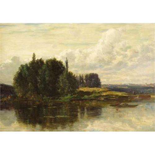 <B>SAMUEL LANCASTER GERRY (American, 1813-1891)</B></I><BR><I>The River's Edge</B></I><BR>Oil on canvas<BR>14 x 20 inches (35.6 x 50.8 cm)<BR> <BR>PROVENANCE:<BR>Private collection, Fairfield, Texas<BR><B>Condition Report:</B> Original canvas, 2 3/8 x 1 1/2 inch patch on the verso in lower right quadrant, some craquelure throughout the clouds, otherwise good condition.<BR><BR><b>Shipping:</b> Framed - without Glass, Medium (<a target="_blank" href="http://www.heritageauctions.com/common/shipping.php">view shipping information</a>)
