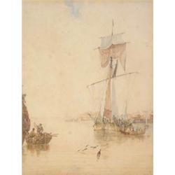 Samuel Owen (1769-1857) watercolour, Rowing boats and Thames barge at anchor, signed, 7.75ins x 6.25ins £400-600
