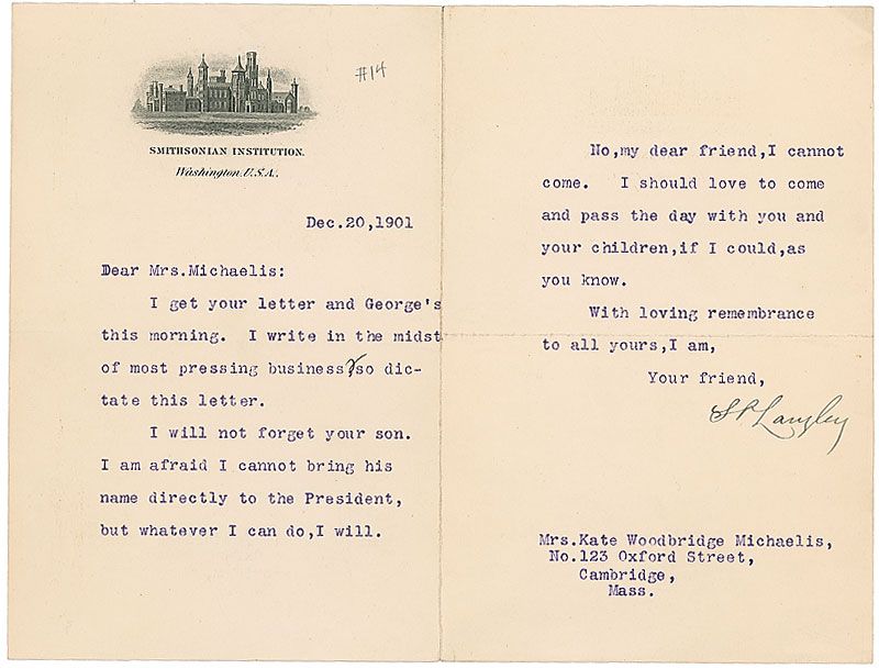 Astronomer and physicist (1834–1906) and the third Secretary of the Smithsonian Institute. Two TLSs, both signed “S. P. Langley,” both two pages on two adjoining sheets, Smithsonian Institute letterhead, dated 1894 and 1901, both to Otho Michaelis. The 1894 letter reads, in part: “I have been out to Cambridge, where I saw Frank. He looks very well and happy. We had a long talk, without getting quite to a financial decision, but I have told him that I think George is such a good brother, that he ought to look to his opinion, rather than to mine.” In fine condition, with uniform toning to one letter. Accompanied by one of the original mailing envelopes.