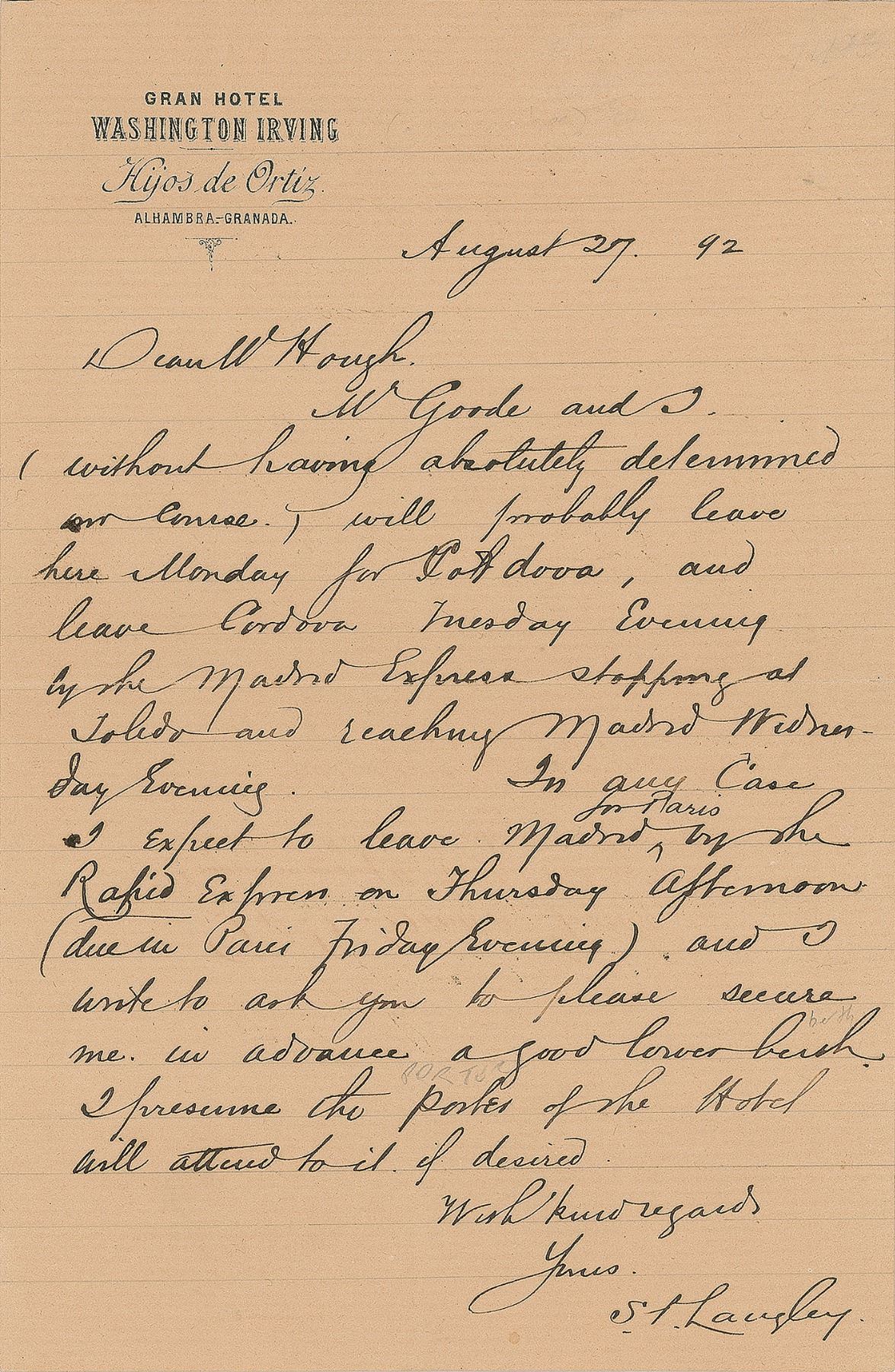 American astronomer, physicist, and aviator (1834-1906), who conducted some of the first manned flights with his Army-funded Aerodrome aircraft. ALS signed “S. P. Langley,” one page, 5.25 x 8, Gran Hotel, Washington Irving letterhead, August 27, 1892. Letter to Walter Hough, in full: "Mr. Goode and I (without having absolutely determined our course) will probably leave here Monday for Cordova, and leave Cordova Tuesday evening by the Madrid Express stopping at Toledo and reaching Madrid Wednesday evening. In any case I expect to leave Madrid for Paris by the Rapid Express on Thursday afternoon (due in Paris Friday evening), and I write to ask you to please secure me in advance a good lower berth. I presume the porter of the Hotel will attend to it if desired." In fine condition. Accompanied by the original mailing envelope, addressed in Langley's own hand.