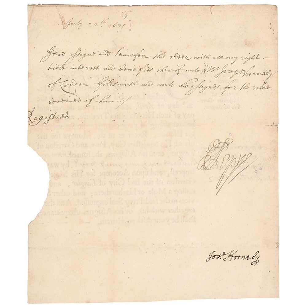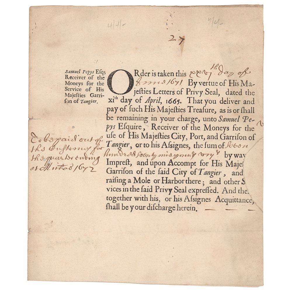 Partly-printed DS, signed “S. Pepys,†one page both sides, 7.25 x 8.75, July 22, 1671. In the partly-printed document on the front, as "Receiver of the Moneys for the Service of His Majesties Garrison of Tangier," Pepys demands the sum of 779 pounds. On the reverse, Pepys pens a handwritten assignation "for this order with all my right, title interest and benefit thereof unto Mr. Joseph Horneby of London Goldsmith and unto his assigns for the value." In very good to fine condition, with trimmed edges, and scattered tiny insect holes.