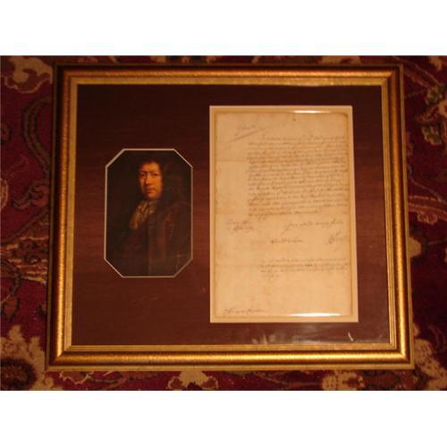 SAMUEL PEPYS, Fine Autograph Letter Signed ?Pepys.? Also signed by fellow officers Middleton and Mennes, 1 page (11-1/4" x 7-3/4"; 299mm x 194mm), Chatham, 13 February 1668, to an unidentified group of gentlemen, confirming insufficient evidence prohibits him from determining anything in a case in which his correspondents are involved. Browning and spotting; some marginal chipping and fraying. Letter has been archivally restored and de-acidified, and is elegantly matted and framed, along with a picture of Pepys, to an overall size of 20-1/2" x 18-1/2". Autograph Letters Signed by Pepys are uncommon. PROVENANCE: Sotheby?s Auctions, Sale #6581, Friday, June 10, 1994, Lot #152, where it carried an estimated value of $4,000-$6,000.