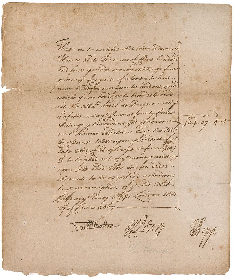 British civil servant (1633–1703) who was promoted to Secretary to the Admiralty in 1673. Pepys is best remembered as the author of a nine-year, multi-volume diary, one of the essential documents of 17th century British history and literature. Manuscript DS, signed “S. Pepys,” one page, 7.5 x 12, June 27, 1667. Authorization for payment reads, in part: “There is owed unto Thomas Pitt the sum of five hundred and four pounds seven shillings four pence for price of eleven tunns nine hundred one quarter and one pound weight of non cordage by him delivered into his Mats Stores at Portsmouth.” Signed at the conclusion by Pepys, Neill Batten, and W. Penn. In good condition, with fully separated lower blank section, scattered toning and foxing, pencil notation under signature, a few edge chips, and small separations to other horizontal folds.