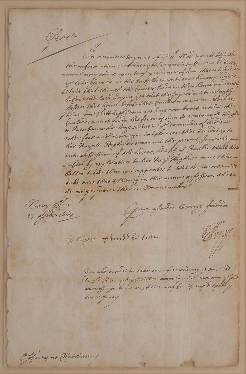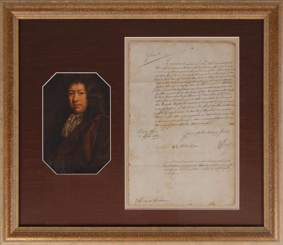British civil servant (1633–1703) best remembered as the author of a nine-year, multi-volume diary, one of the essential documents of 17th-century British history and literature. ALS signed “S. Pepys,” one page, 7.75 x 11.75, February 13, 1668. Official letter from the naval office confirming that insufficient evidence prevents him from coming to a determination in a certain case. Signed at the conclusion by Pepys and fellow officers Middleton and Mennes. Tastefully matted and framed with a portrait to an overall size of 20.5 x 18. In very good condition, with chipping to edges, and scattered light staining. Provenance: Sotheby’s, 1994. Pepys is uncommon in autograph letters.