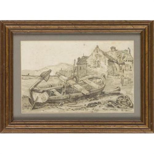 <B>SAMUEL PROUT (British, 1783-1852)</B></I><BR><I>Boat on a Beach</B></I><BR>Pencil on paper<BR>5-1/4 x 8-1/4 inches (13.3 x 21.0 cm)<BR> <BR>PROVENANCE:<BR>Chester Dale, New York, New York<BR><B>Condition Report:</B> Some foxing, not examined outside of frame, otherwise good condition. <BR><BR><b>Shipping:</b> Framed - with Glass, Small (<a target="_blank" href="http://www.heritageauctions.com/common/shipping.php">view shipping information</a>)