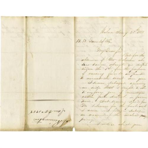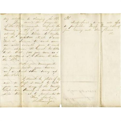<B>Samuel Remington Autograph Letter Signed</B></I> "<I>S. Remington</B></I>". Two pages, 10.5" x 8.25", January 25, 1858, discussing $100,000 in capital stock, plain paper, ink. Samuel Remington, son of gun innovator Eliphalet Remington, helped his father run the company, concentrating on selling the popular firearms on the international market. The Connecticut gunmaker writes in this letter: "<I>My Dear Sir, But for the absence of Mr. Johnson who has been absent in New York since the 1st for the purpose of securing funds in part to meet the amt. due you I have delayed ansring in order that I might be able to inform you of remittance either from New York of from here. Not having heard from Mr. Johnson for the past week I can no longer delay on account of the inclosed proxy. I notice what you say . . . to closing the Blg (building) you and the friends of the blg must defacto the move. If it is not possible at the present times to make up the capitol stock to $100,000 cut it down to such sum as will enable you to such full shares. It would be better to do that as you can as I understand it than to close the Blg. With good management on your part you can in a short time bring up the Blg - I should be glad if it were so that I could be with you on the day of the meeting. But our is such as this time as to preclude it. Yours truly S. Remington. P.S. Don't fail to use all efforts to . . . out the flaws.</B></I>" Fine condition.<BR><BR><b>Shipping:</b> Flat Material, Small (<a target="_blank" href="http://www.heritageauctions.com/common/shipping.php">view shipping information</a>)