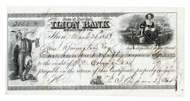 SAMUEL REMINGTON (1819-1892) Executive in Remington & Sons. Partially Printed Check Signed on verso, "S. Remington. 7 ¾” x 3 ¾”. March 25, 1859. The check reads, in part: "Had deposited in this Bank One hundred & fifty Dollars to the credit of J.C. Conouse Payable on the return of this Certificate properly endorsed ..." Signed on verso "S Remington" Multiple fine vignettes. A few pinholes Overall Very Fine.