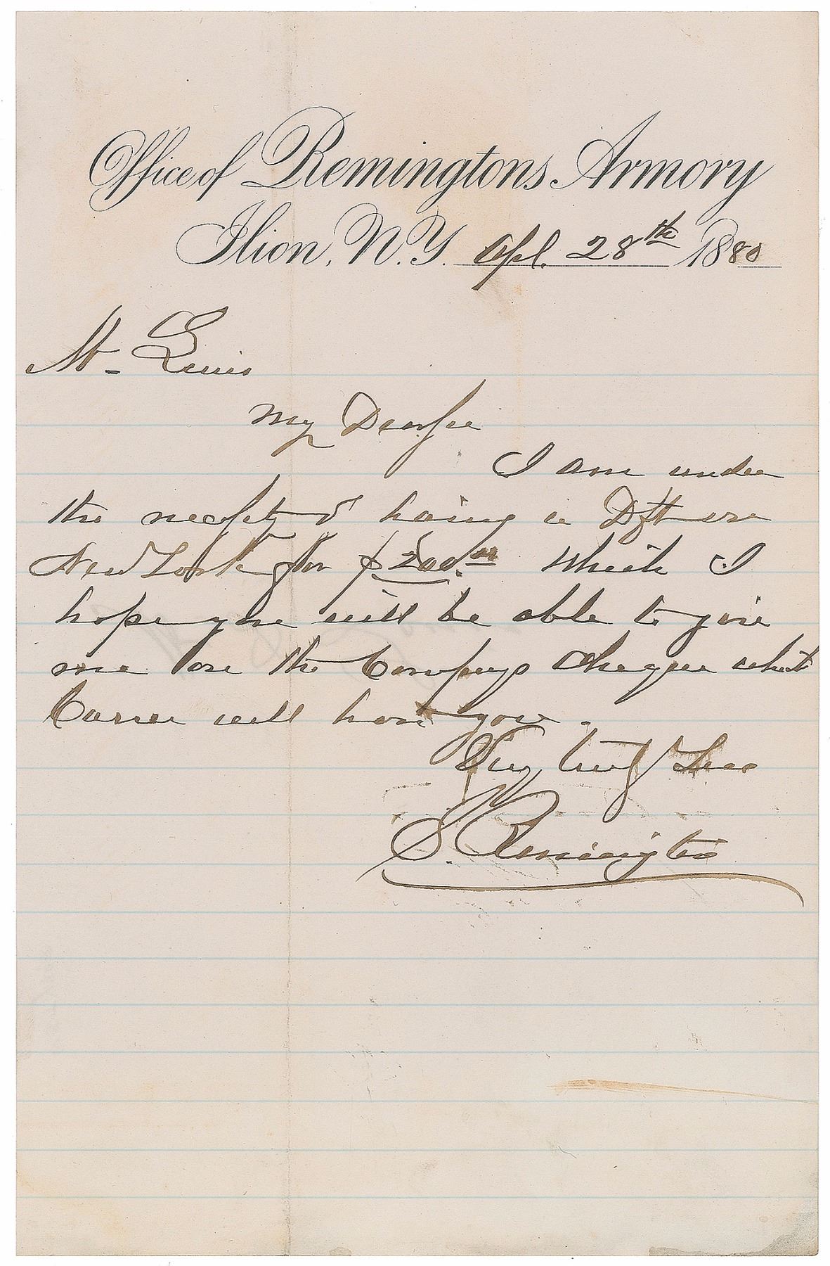 American firearms manufacturer (1819–1892). Rare ALS signed “S. Remington,” one page, 5.5 x 8.5, Office of Remingtons Armory letterhead, April 28, 1880. Letter to Mr. Lewis concerning a $200 transaction. In fine condition, with a moderate vertical fold. While Remington's checks are common, this is just the second ALS by him that we have encountered.
