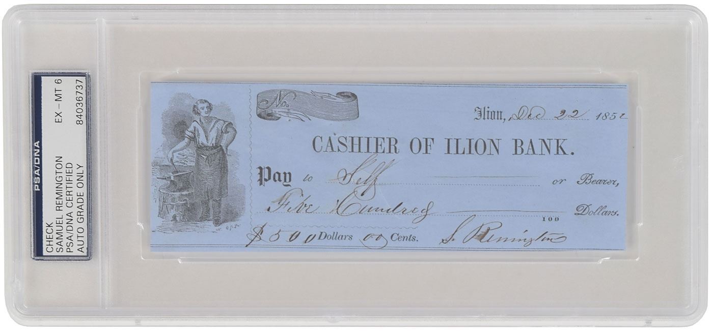 American firearms manufacturer (1819–1892). Cashier of Ilion Bank check, 6.5 x 2.5, filled out and signed by Remington, "S. Remington," payable to "Self" for $500, December 22, 1852. Encapsulated in a plastic PSA/DNA authentication and grading holder, evaluating the autograph as "EX-MT 6." In fine condition.