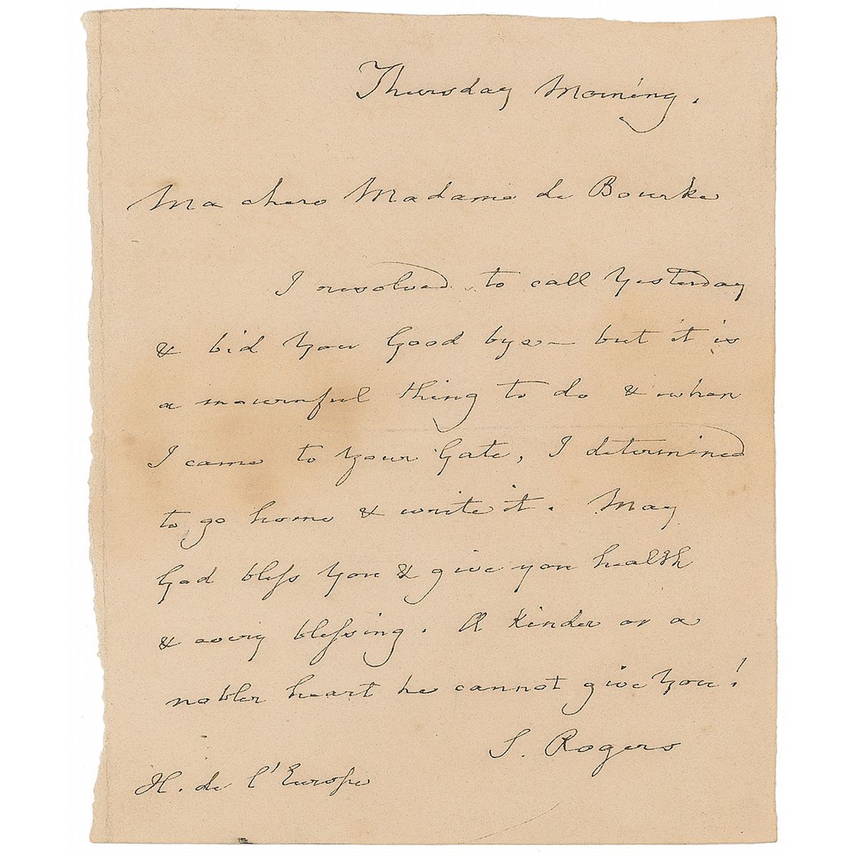 Celebrated English poet (1763–1855) who counted Wordsworth, Walter Scott, and Byron among his friends. ALS signed “S. Rogers,” one page, 3.75 x 4.5, no date. Letter to Madame de Bourke. In part: “I resolved to call yesterday & bid you Good bye…& when I came to your Gate, I determined to go home & write it. May god bless you & give you health & every blessing.” In fine condition, with subtle staining and irregularly trimmed edges.