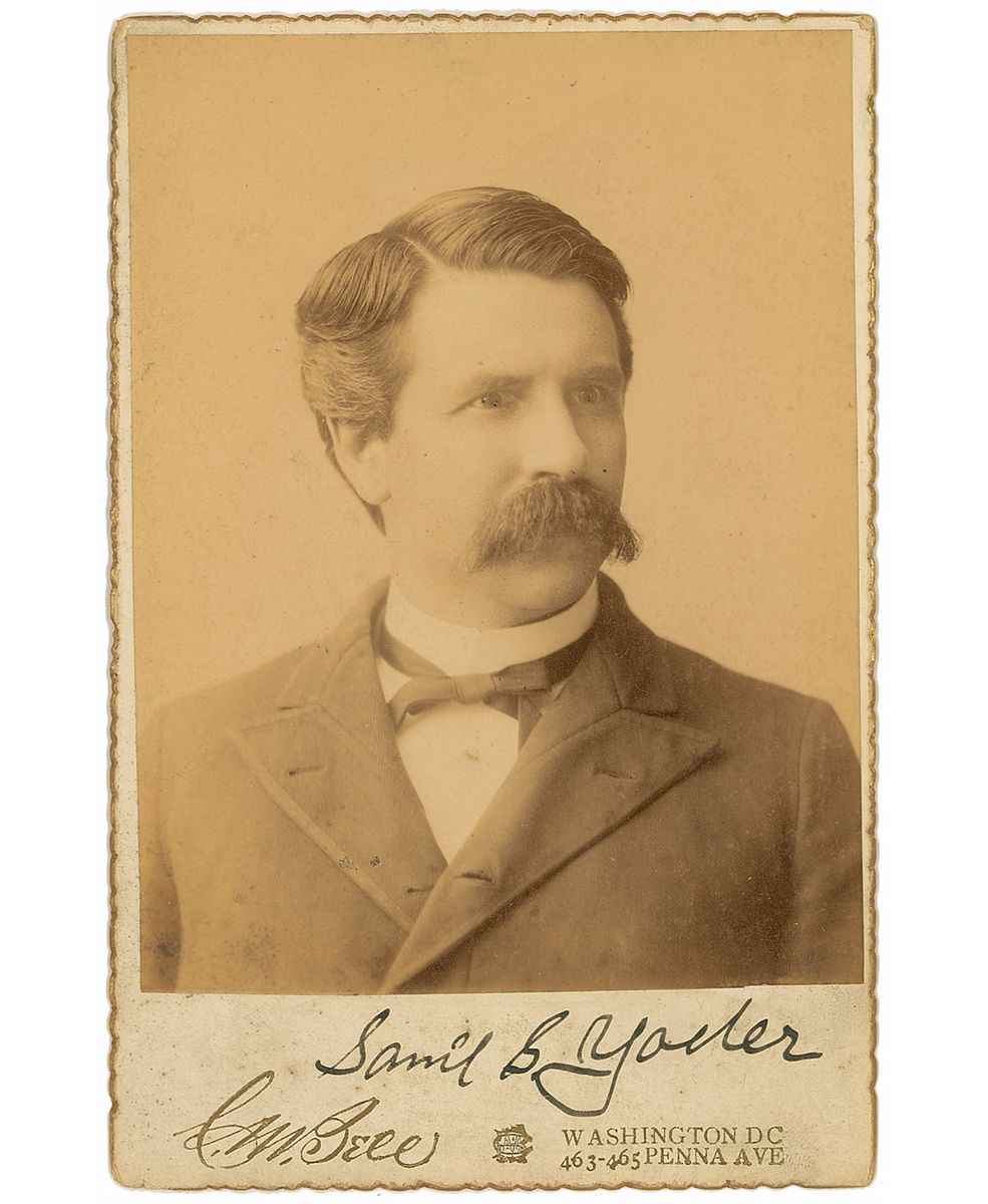 Politician and lawyer from Ohio (1841–1921). Original 4 x 6.5 deckle-edge cabinet photo by C. M. Bell of Washington, D. C., signed in the lower border in black ink, “Sam’l S. Yoder.” Light soiling to lower border and a bit of soiling to image, otherwise fine condition.