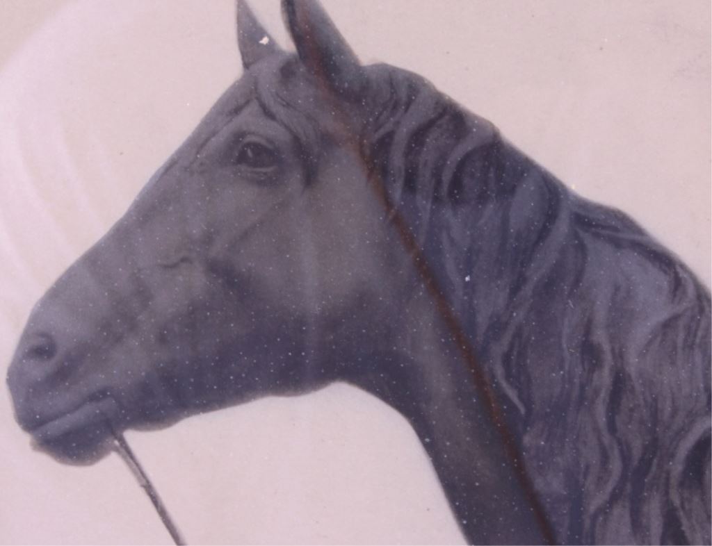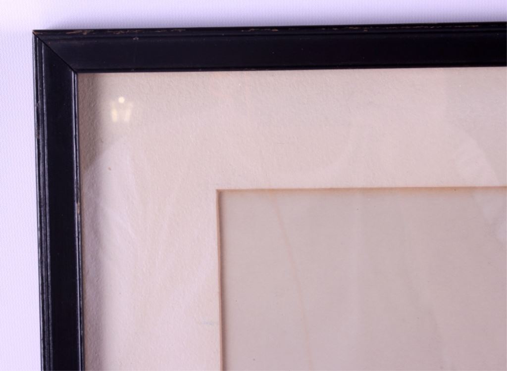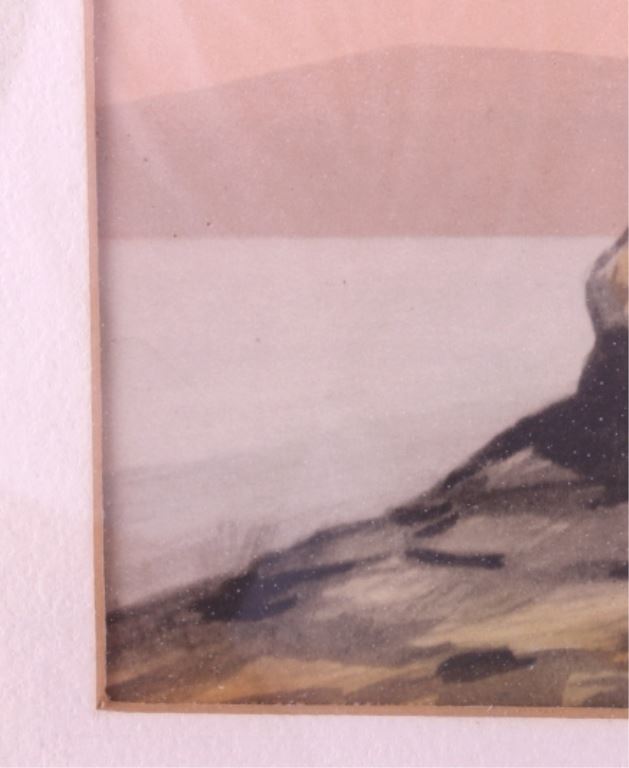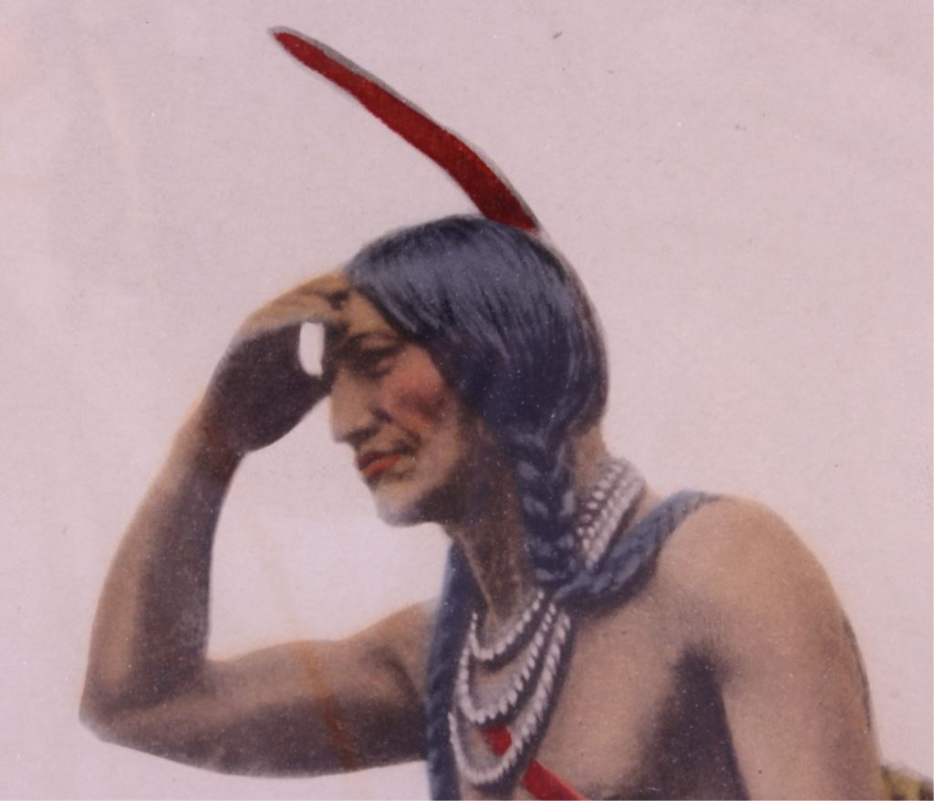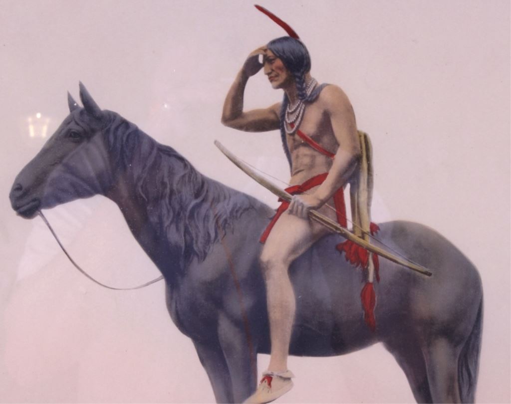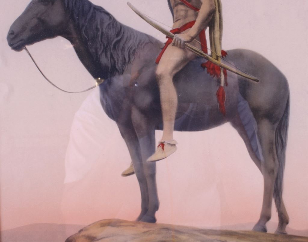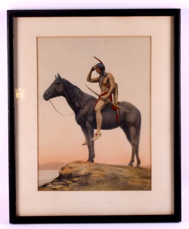 This is a hand colored mezzotint. It is titled "The Scout" and was made by Samuel Schiff. Schiff was the proprietor of a print shop and photography studio in New York In the late 1800's to early 1900's. The mezzotint shows a Native American scout on lookout atop his horse. This piece is in good condition. The frame measures 23.25" x 19".
