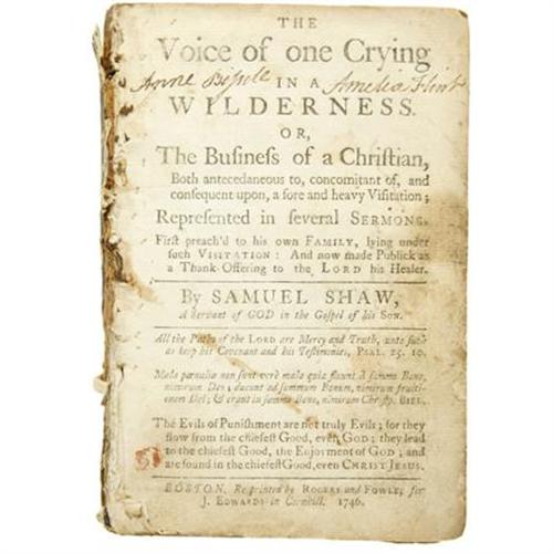 <B>Samuel Shaw, <I>The Voice of One Crying in a Wilderness, or, The Business of a Christian</B></I>,</B></I> (Boston: Reprinted by Rogers and Fowles for J. Edwards in Cornhill, 1746), 176 pages, 24mo (4” x 5 ¾”), leather covered wood boards, loose front board, staining and some minor tears, else very good. <B></B></I><BR><BR><b>Shipping:</b> Books & Catalogs (<a target="_blank" href="http://www.heritageauctions.com/common/shipping.php">view shipping information</a>)