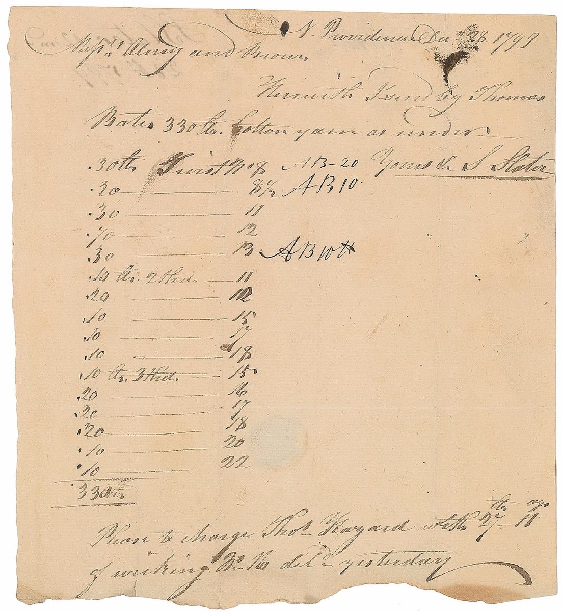 English-American industrialist (1768–1835) called the ‘Father of the American Industrial Revolution,’ known for importing British textile technology to the United States. ADS, signed “S. Slater,” one page, 7.5 x 8, December 28, 1799. Document concerning an order of cotton, in part: “Herewith I send by Thomas Bates 330 lbs Cotton…Please to charge Thos. Hazard.” In fine condition, with paper loss to lower edge.