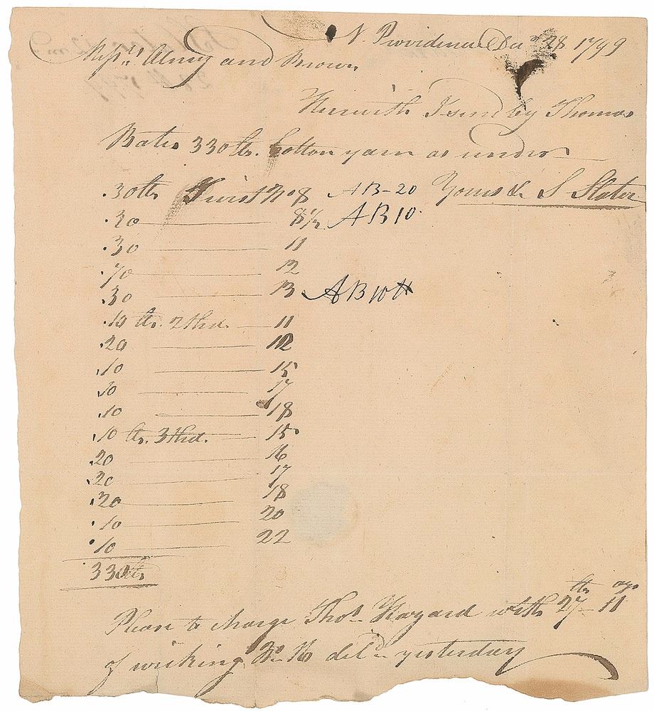 English-American industrialist (1768-1835) called the 'Father of the American Industrial Revolution,' known for importing British textile technology to the United States. ADS, signed "S. Slater," one page, 7.5 x 8, December 28, 1799. Document concerning an order of cotton, in part: "Herewith I send by Thomas Bates 330 lbs Cotton...Please to charge Thos. Hazard." In fine condition, with paper loss to lower edge.